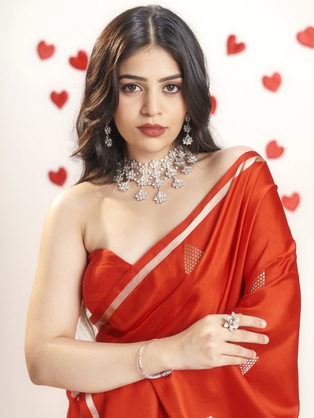 With soft curls cascading over her shoulders and a subtle yet defined makeup look, she strikes the perfect balance between elegance and attitude.