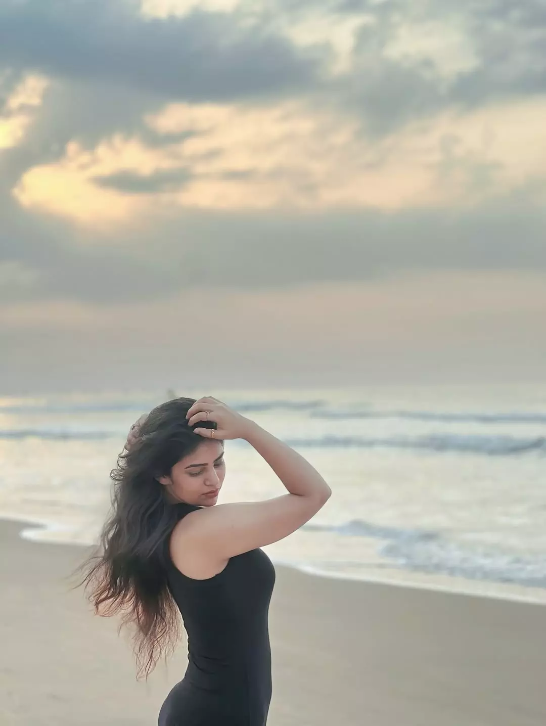 , with styling by @lakshman_murthy99, makeup by @sandhya_s_makeover, and hair by @surendra__hairstylist, every detail sings—long waves cascading, a playful smile blooming, and one hand grazing the rail as if the world is hers to climb. The Tollywood actress, known for her vibrant screen presence, turns a simple stairwell into a runway of quiet power and fiery elegance.