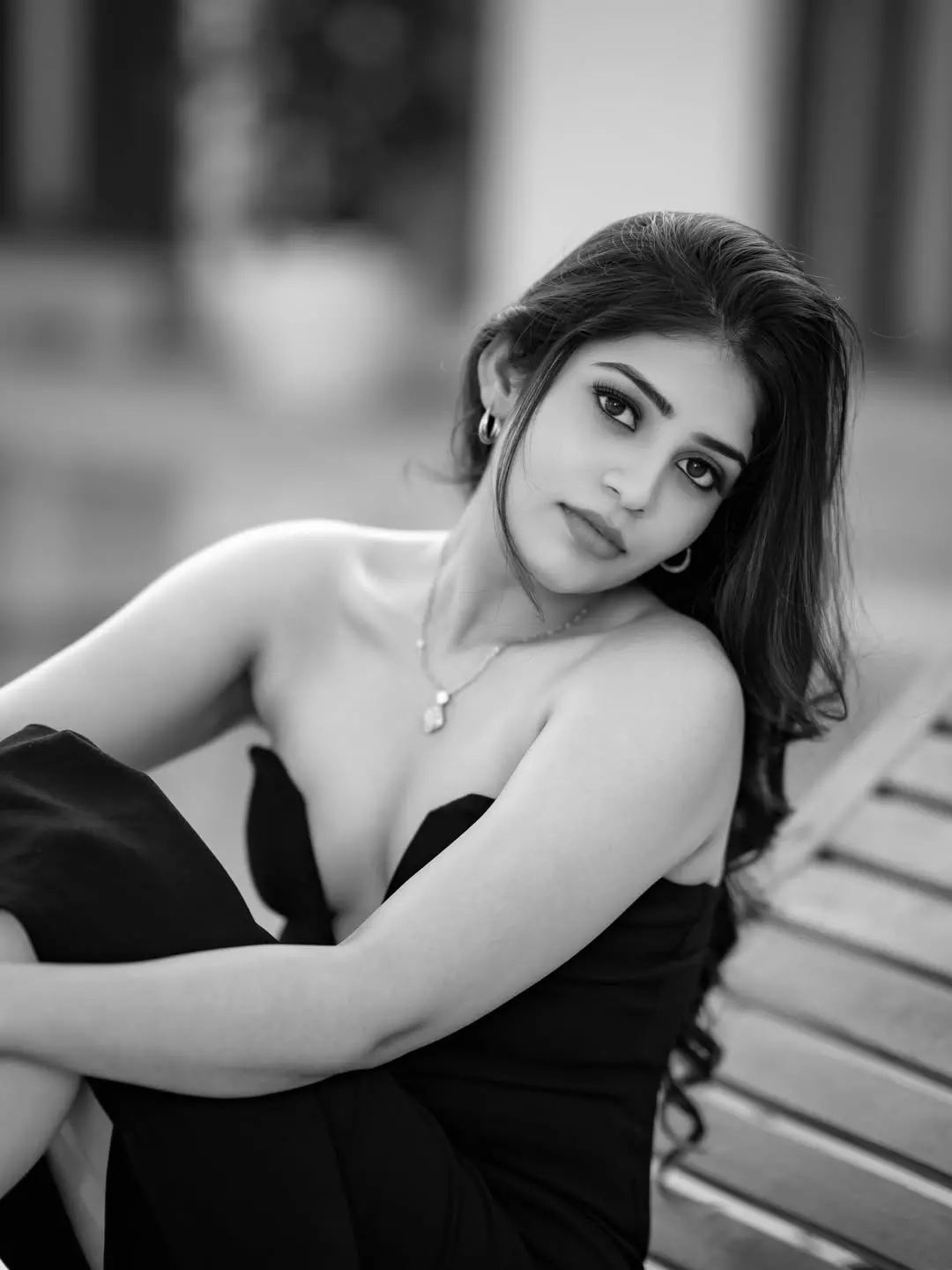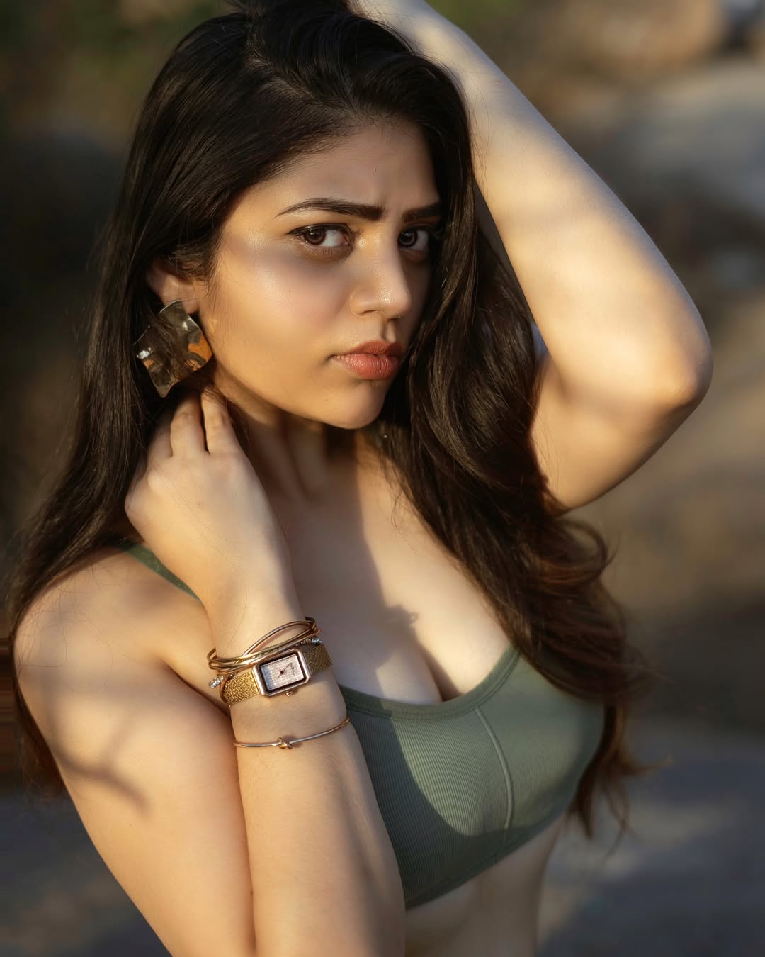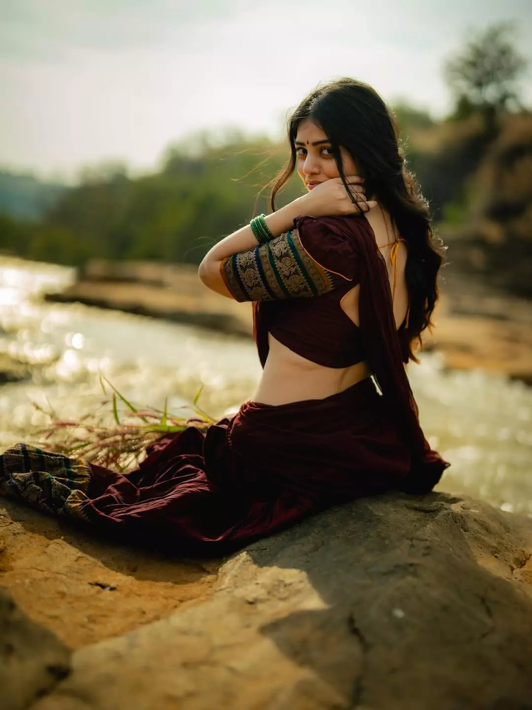 In this serene riverside portrait, Bandhavi Sridhar carries quiet strength and grace. Seated on a rock with the flowing water and golden sunlight behind her, she looks over her shoulder with piercing eyes that speak volumes.