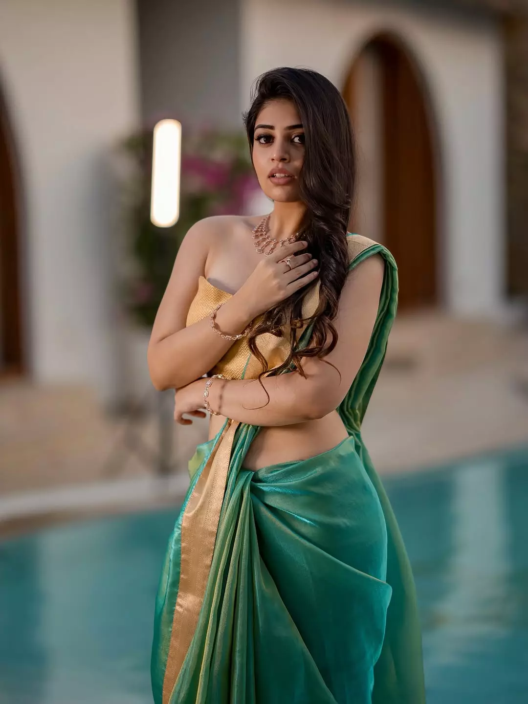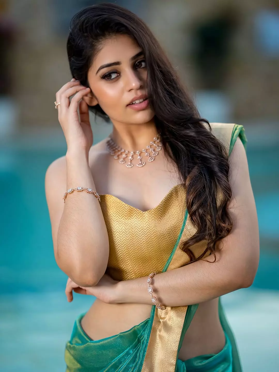 Bandhavi Sridhar looks elegant in the new Instagram photo. She is seen near a pool, wearing a light sea-green saree with a golden border and a matching golden blouse.