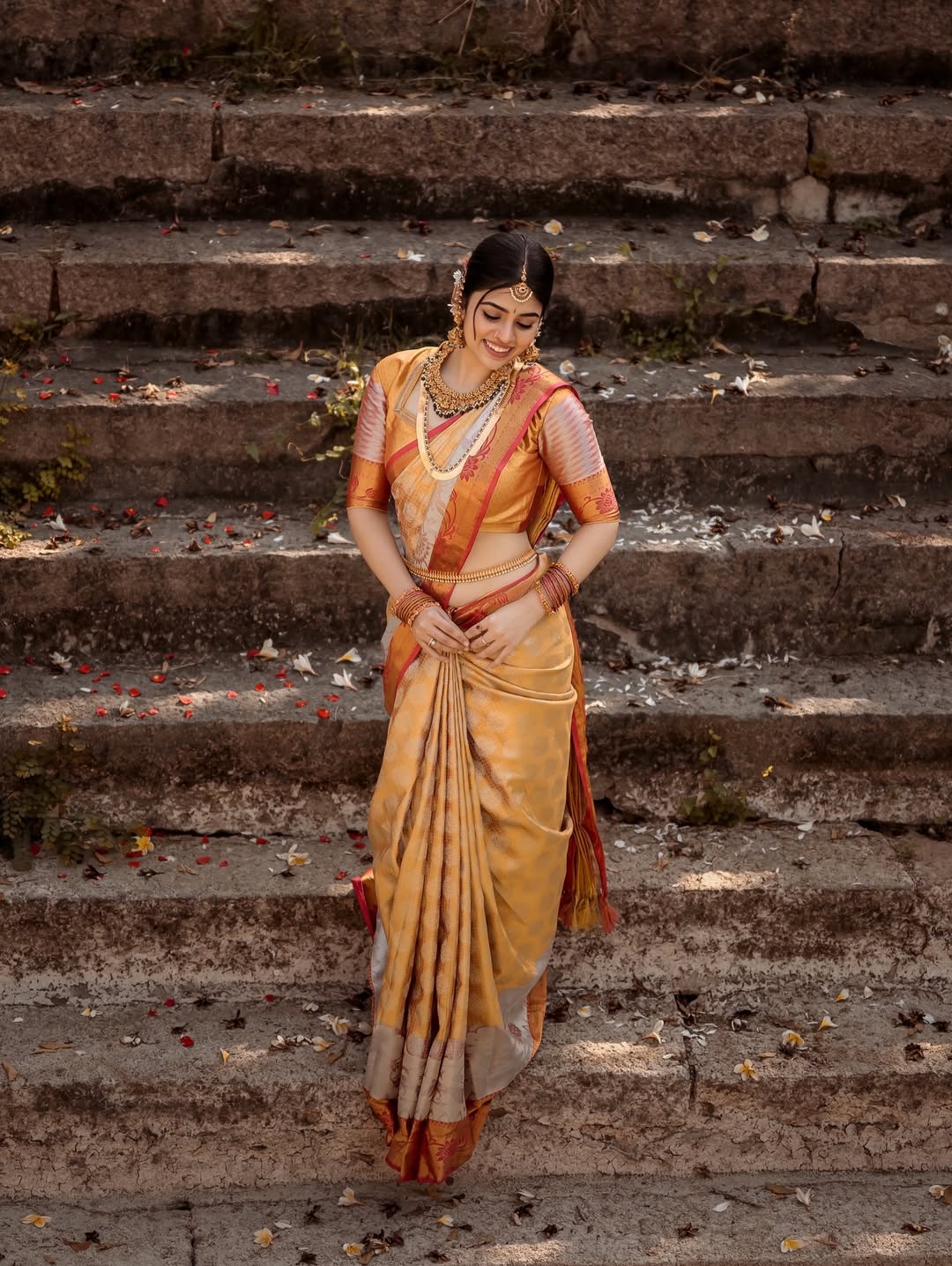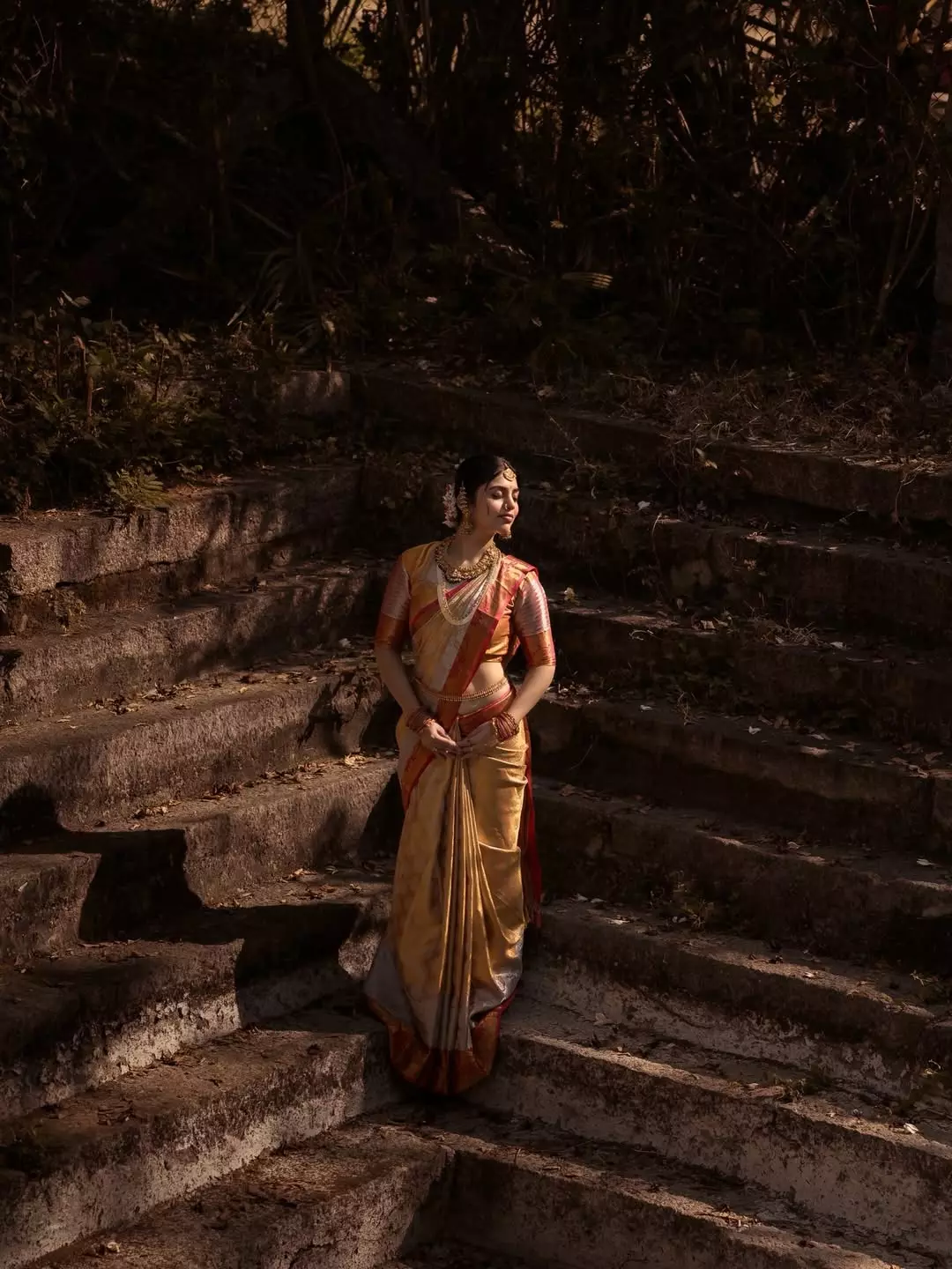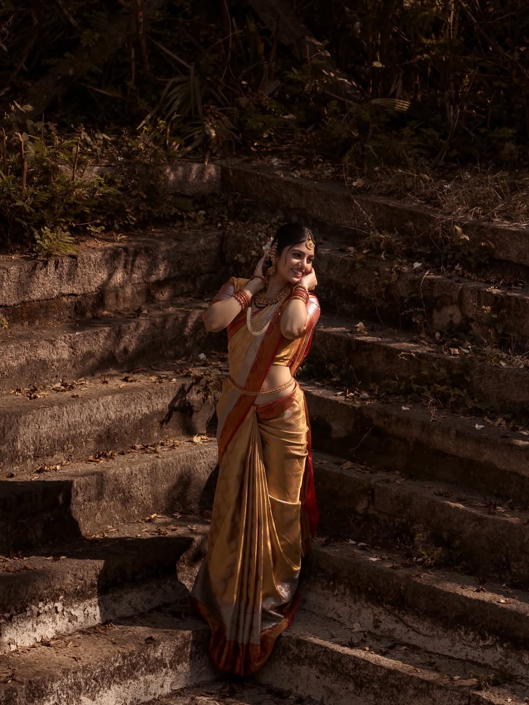 In the photo, Bandhavi is seen wearing a classic silk saree in golden and red shades. The saree gives a rich and traditional feel and suits her perfectly. She is standing on old stone steps and the photo was shot by Anil Donoji, who captured Bandhavi’s expressions beautifully using natural light and earthy tones. The makeup was done by Bridal Makeup by Sujatha and silk saree was styled from Silk Sarees Store, while the jewellery was provided by Jewel Planet. The complete styling was done by Reshma Stylist.