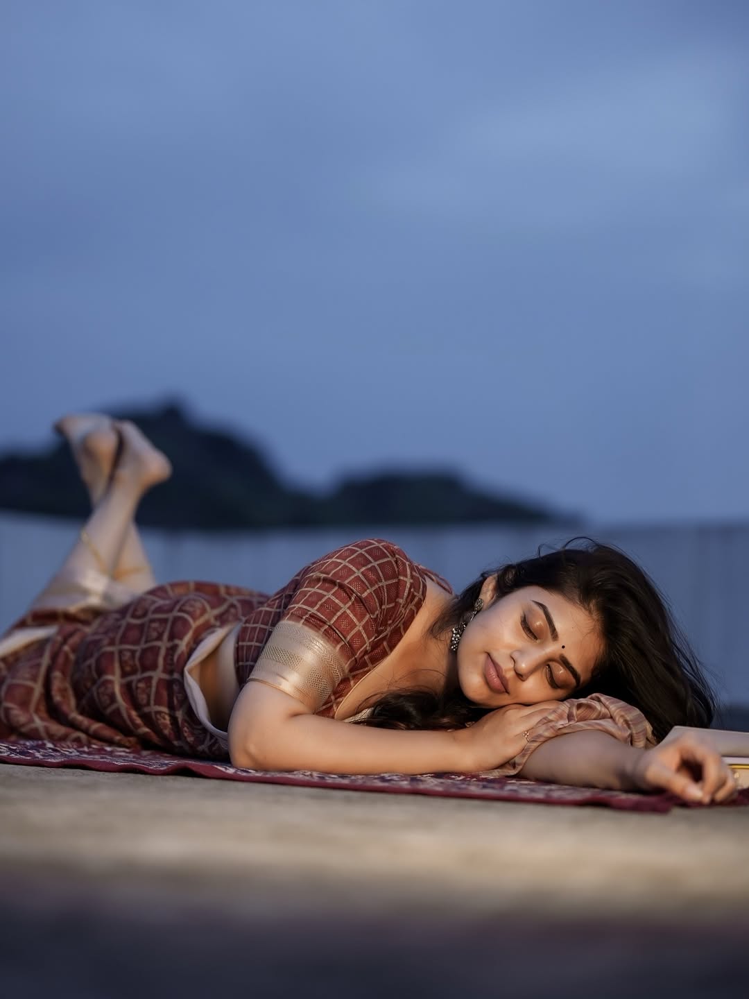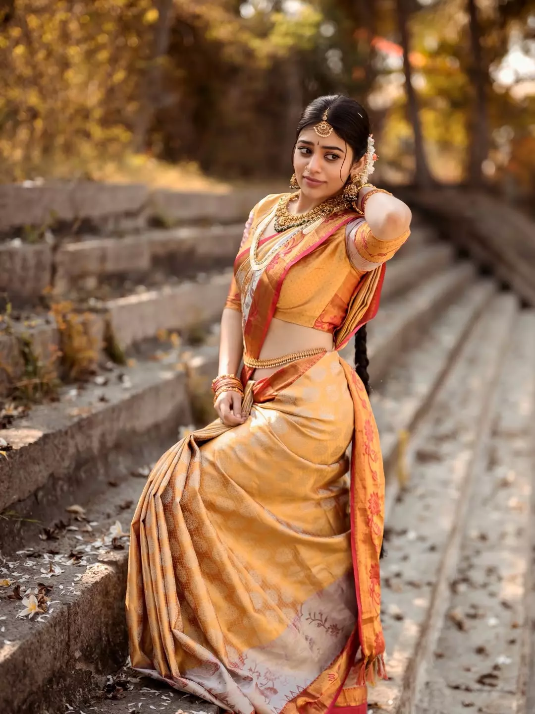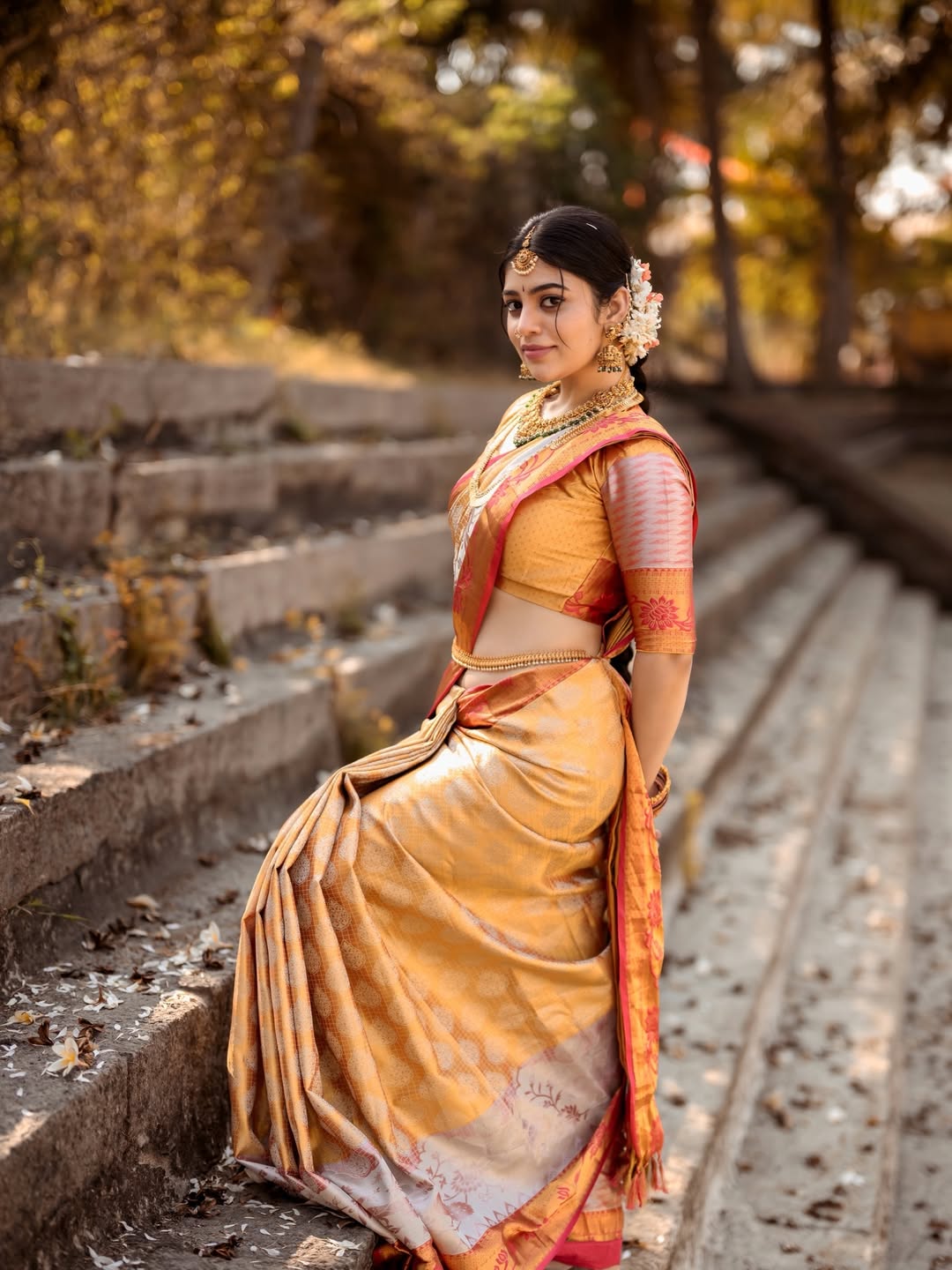 In the photo, Bandhavi is seen wearing a classic silk saree in golden and red shades. The saree gives a rich and traditional feel and suits her perfectly. She is standing on old stone steps and the photo was shot by Anil Donoji, who captured Bandhavi’s expressions beautifully using natural light and earthy tones. The makeup was done by Bridal Makeup by Sujatha and silk saree was styled from Silk Sarees Store, while the jewellery was provided by Jewel Planet. The complete styling was done by Reshma Stylist.