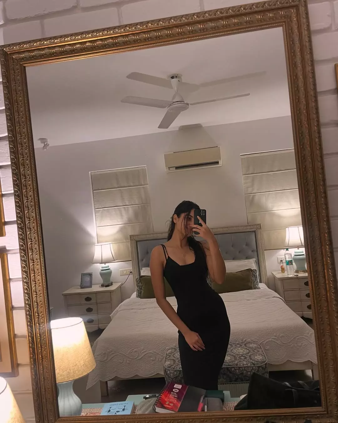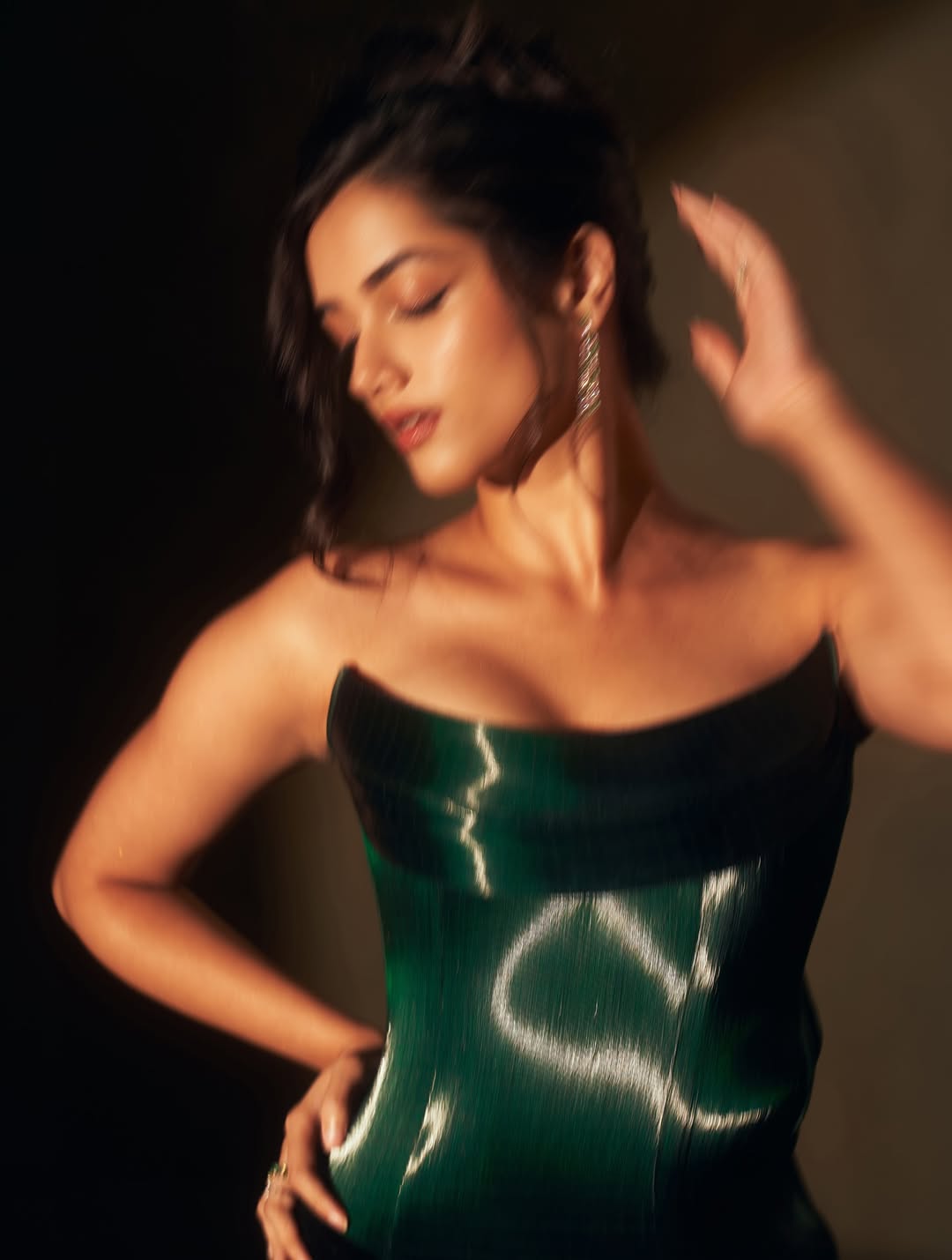 Bhagyashri Borse is pure midnight magic in this mesmerizing frame, draped in a shimmering charcoal lehenga that catches every speck of light. With the city lights twinkling behind her and her dupatta floating like a veil of stardust, she glows with an ethereal charm that feels almost otherworldly. Starry glow, indeed – she’s the brightest constellation in the night.