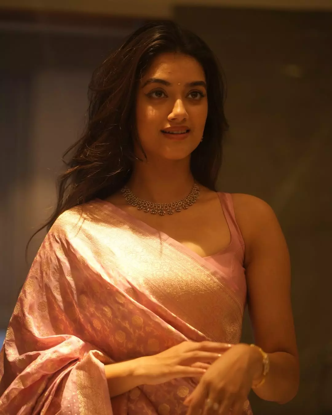 Bhagyashri Borse radiates elegance in this stunning Sankranti celebration photo, draped in a dreamy lavender sheer saree from @anushareddy_couture.