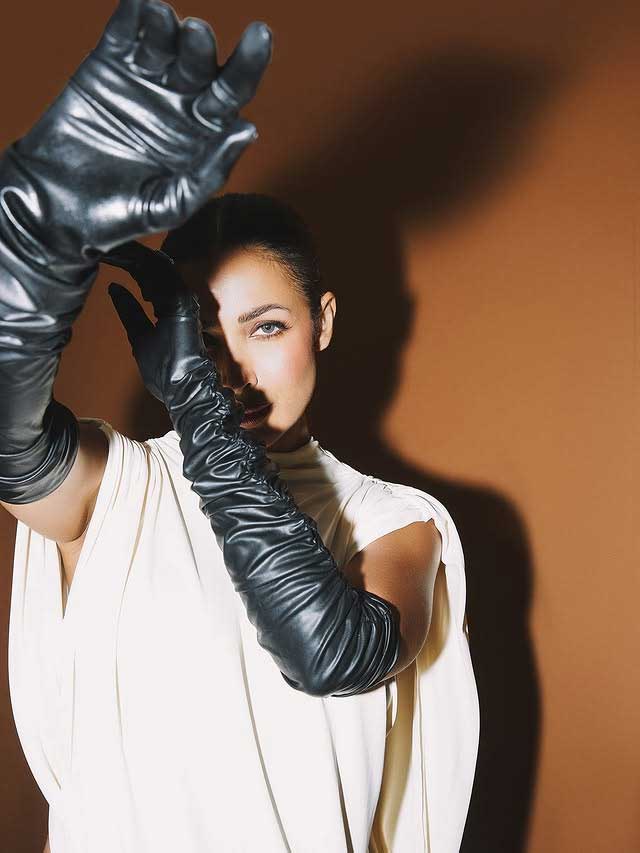 Dressed in a white draped top with daring side cutouts, she flaunts her sculpted frame with absolute confidence. The standout detail? Dramatic black opera gloves that add a powerful vintage glam vibe to the look. Her sleek, pulled-back hairdo complements the clean lines of the outfit, while her emerald statement ring injects a hint of luxury.