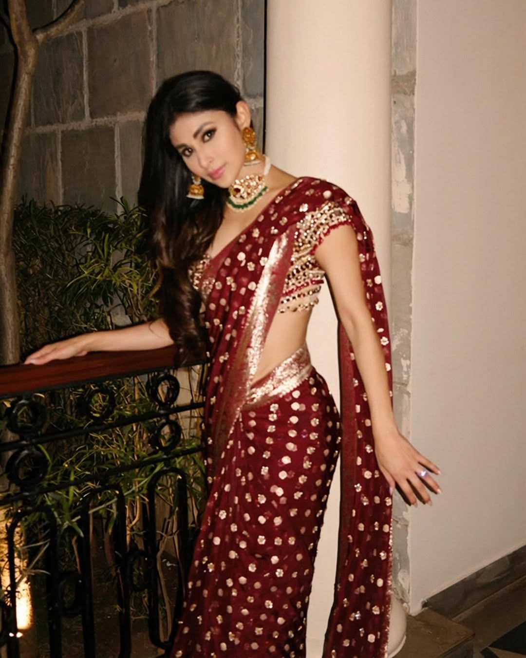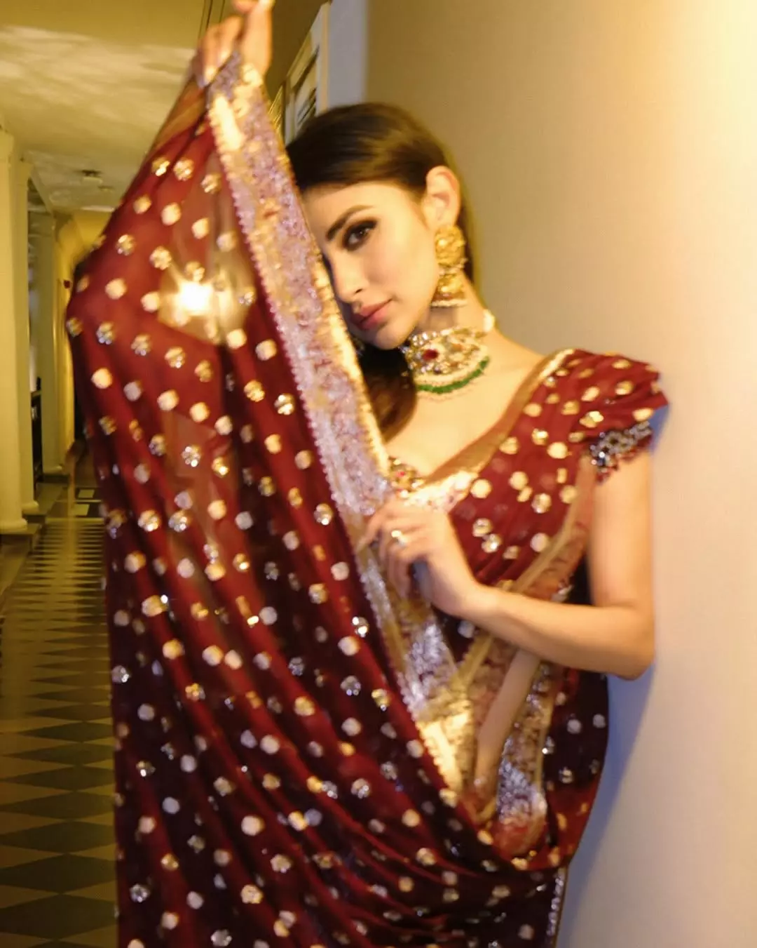Mouni Roy Glows in Wine-Maroon Banarasi Saree