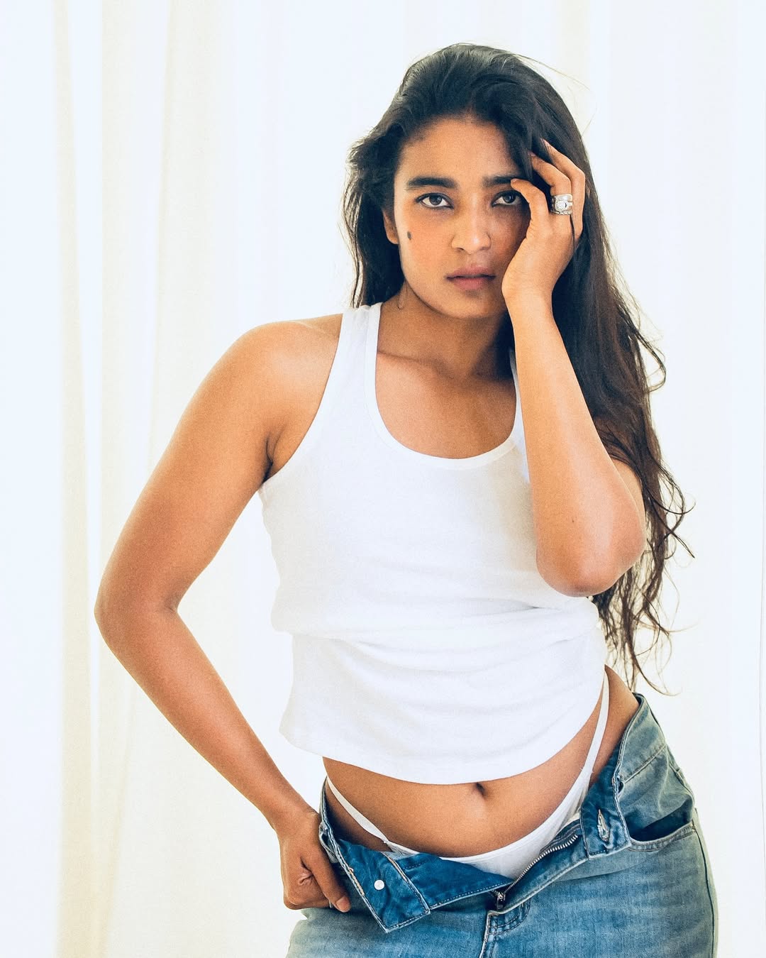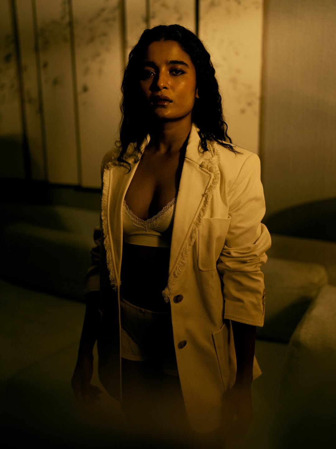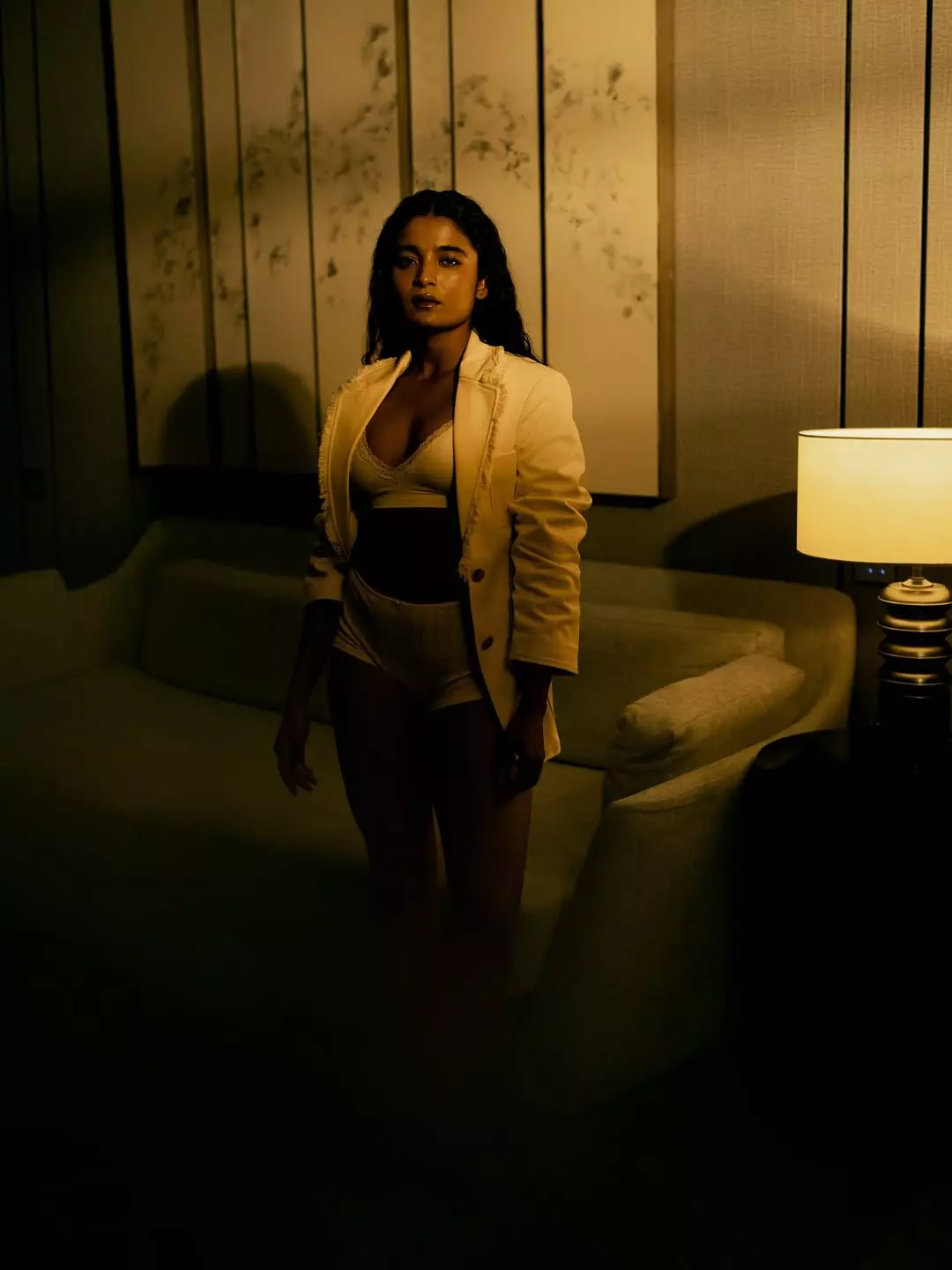 Chaithra J Achar turns up the heat in this powerful and striking portrait — Blazing! perfectly captures the essence of her look. Dressed in a chic white blazer layered over a bralette and shorts, she exudes confidence and raw energy. The moody lighting and intense gaze add depth to the frame, highlighting her fearless attitude and magnetic screen presence. With this photo, Chaithra proves that style isn’t just about fashion — it’s about owning your power, your poise, and your fire.