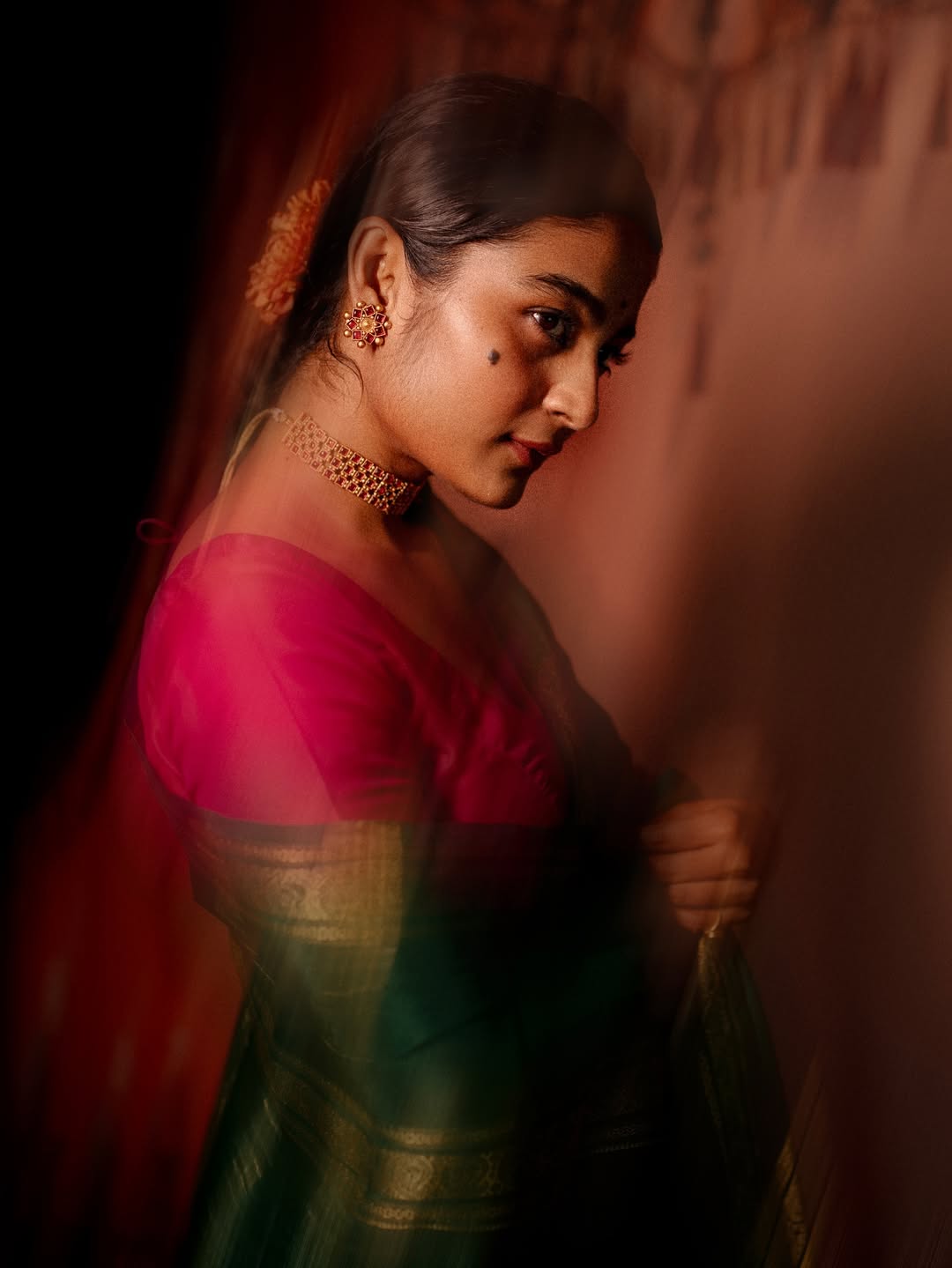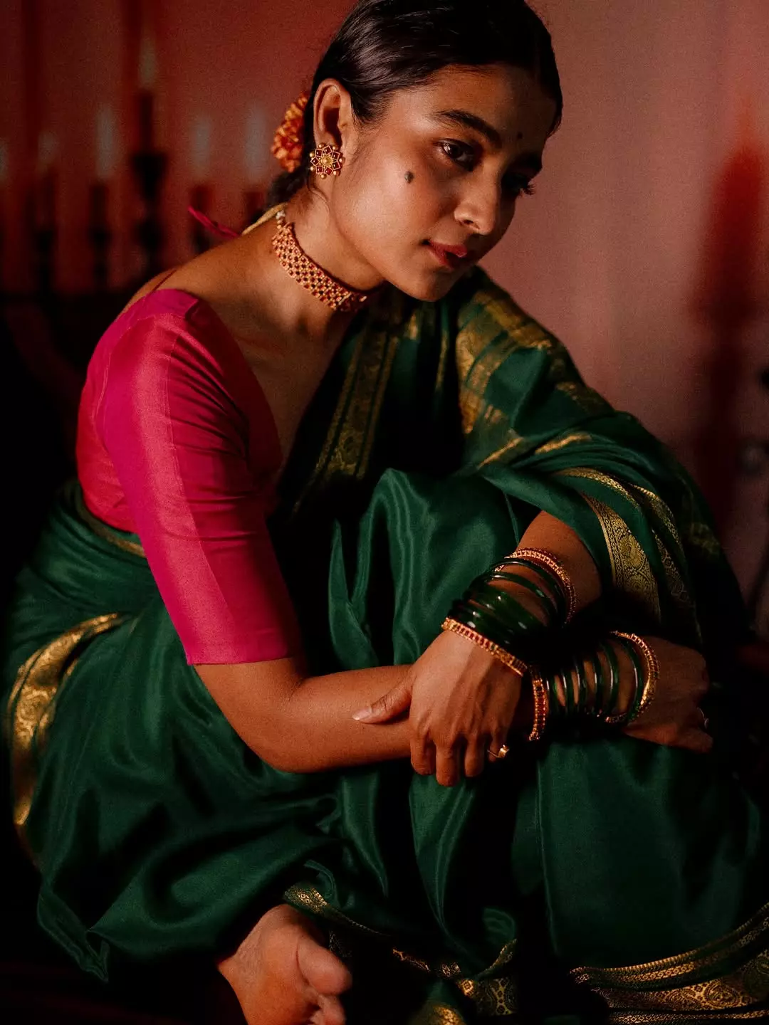 By: Priya Chowdhary Nuthalapti | 9 Aug 2025 12:28 PM ISTActress Chaithra J Achar radiates timeless beauty in a traditional green silk saree with intricate golden zari borders, paired with a vibrant pink blouse that adds a striking contrast. The rich drape, styled with sophistication, perfectly complements her graceful persona.