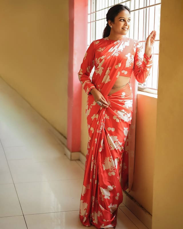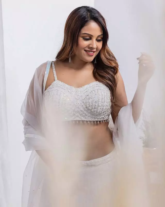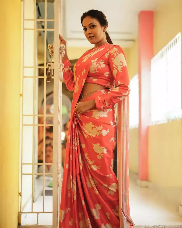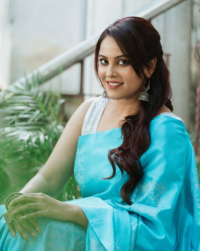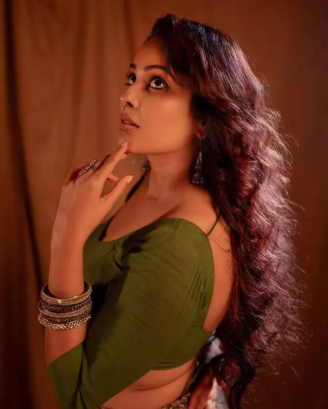 Actress Chandini Tamilarasan shared a beautiful photo on Instagram, captioned "Velvet voice, wildfire soul." She wore a stylish green blouse and a long printed skirt designed by Myura by Anitha Prabhu. Her look was completed by makeup artist @mua_the_beautyedit, hairstylist @prem_hairstyle and stylist @navaa_rajkumar.