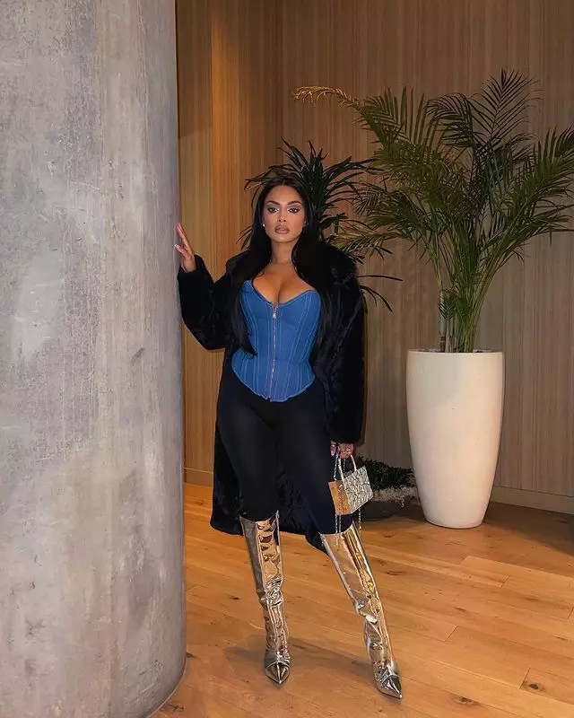 Her flawless skin, highlighted cheekbones, and smokey eye makeup elevate the glam factor, while the shimmering jewelry and elegant hand pose add just the right touch of luxury.