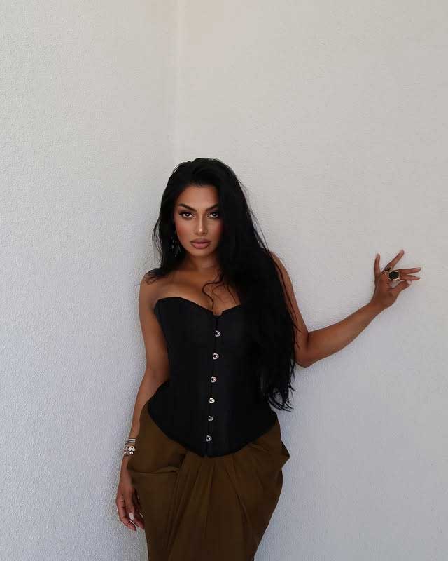 The relaxed, reclining pose on white linens creates a contrast that makes the outfit and her radiant presence pop even more. Chandrika proves once again that she owns every camera angle and sets the bar high when it comes to sultry, sophisticated fashion.