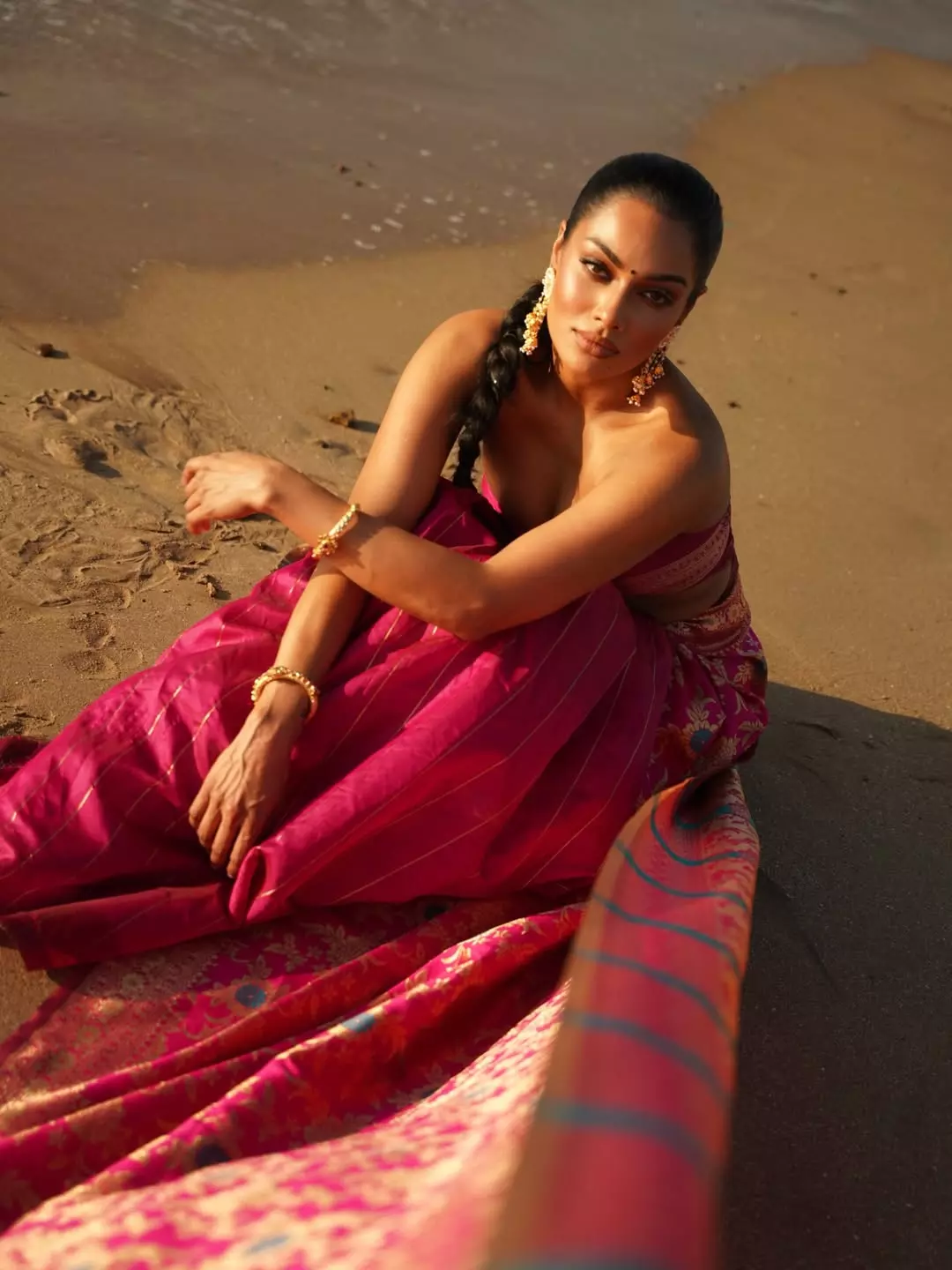 By: Tupaki Desk | 13 Feb 2026 11:38 PM ISTChandrika Ravi mesmerizes in this ethereal beach photoshoot, standing gracefully at the water's edge in a vibrant pink and gold saree with a matching strapless blouse, the waves gently lapping at her feet. Her long braided hair, glowing skin, and poised stance against the golden sunset and palm-lined horizon evoke timeless elegance and coastal romance. The captivating Malayalam caption "സമുദ്ര കണ്ണുകൾ" (meaning "Ocean Eyes") perfectly captures the dreamy, sea-reflecting allure in her gaze. Photographed by @ishanzaka, the image highlights her poised confidence and natural beauty in a traditional yet bold ensemble.