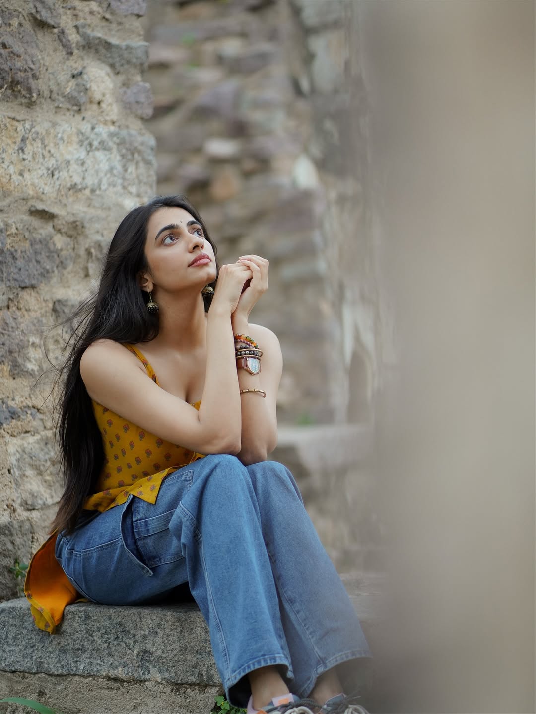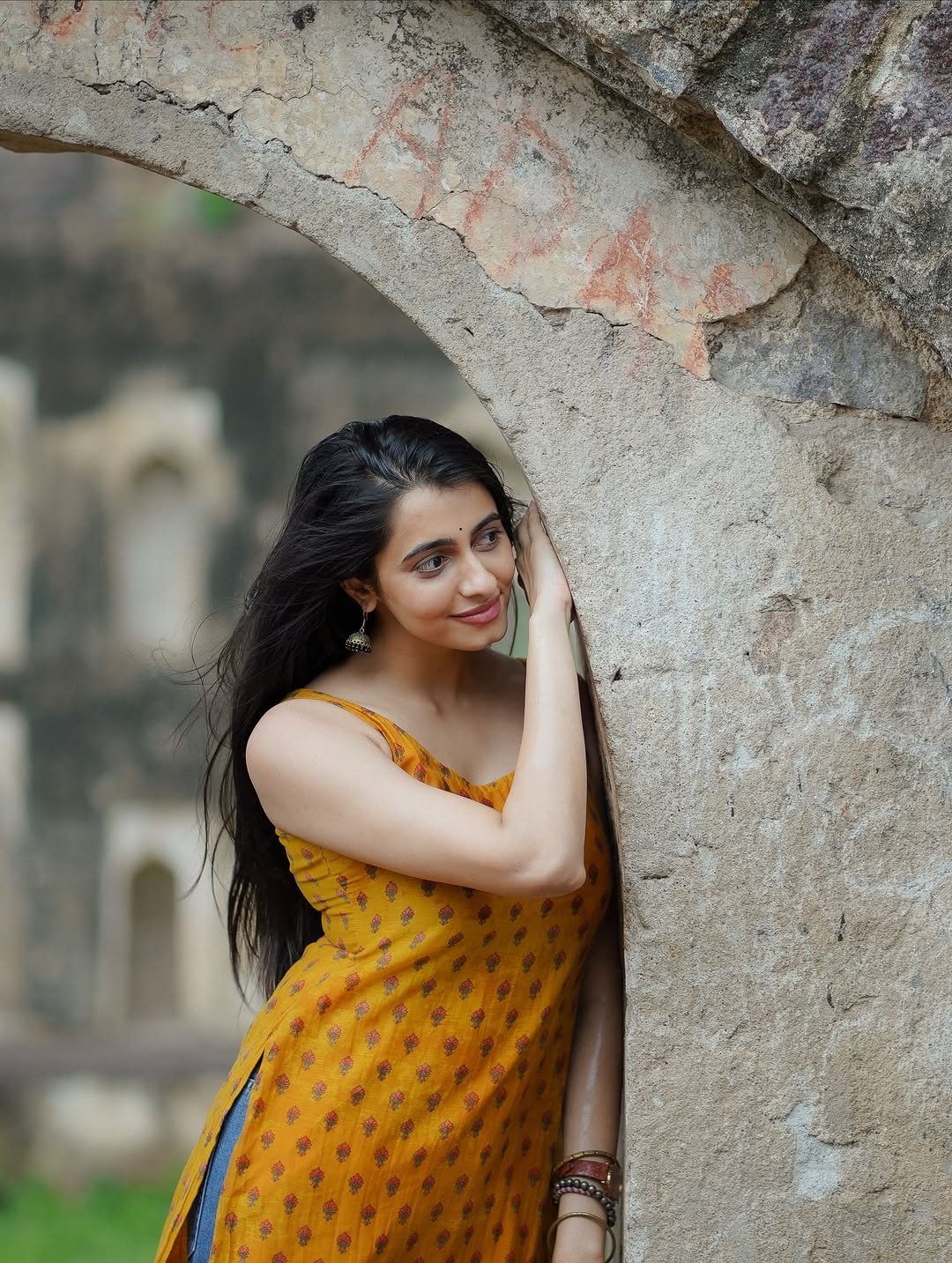 By: Tupaki Gallery Desk | 25 Oct 2025 10:26 AM ISTActress Cherukuri Maanasa Choudhary radiates effortless beauty and charm in her latest look. When the team said “Golkonda veldham ani team ni pilishtey,” what was planned as a casual outing turned into a delightful photoshoot moment. Dressed in a mustard-yellow printed sleeveless kurti paired with denim, Maanasa perfectly embodied simplicity with a touch of elegance. Her minimal accessories — classic jhumkas, bracelets, and a warm smile completed the look, capturing her natural grace beautifully.