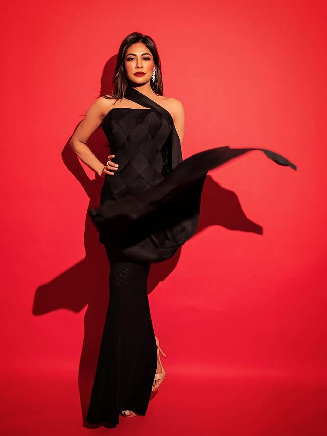 pictures on Instagram, wearing an elegant black dress. The caption was simple but stylish: “chitrangda ❤️🖤.” Her look was sophisticated and bold, featuring a one-shoulder black gown with a flowing design.