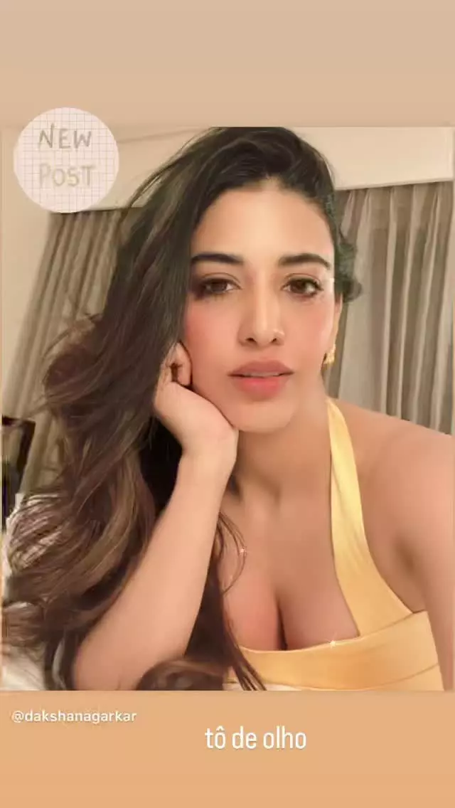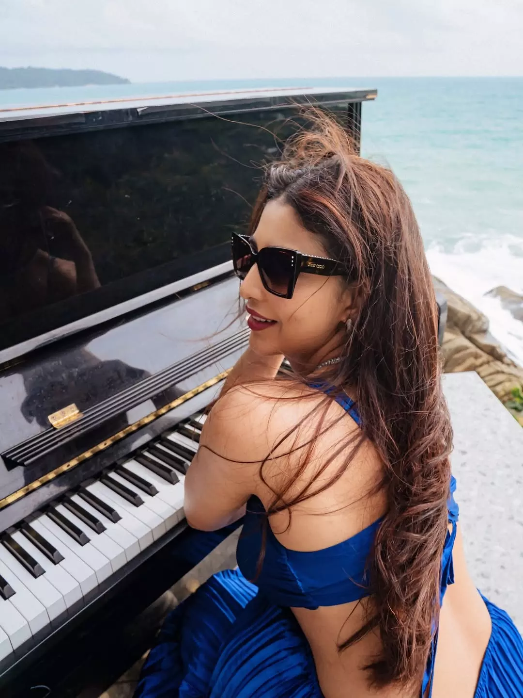 In this captivating beachside photograph, Daksha Nagarkar exudes effortless elegance and confidence. Wearing a striking blue outfit paired with bold sunglasses and a statement neckpiece, the actress effortlessly blends glamour with a cool, vacation-ready vibe. Her windswept hair and poised expression perfectly capture her stylish persona that fans adore.