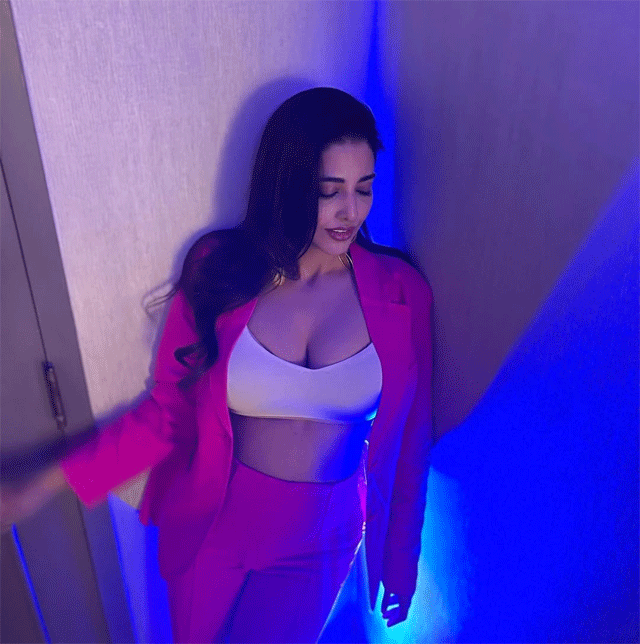 Wearing a white blazer paired with a pleated skirt and a ribbed tank top, Daksha stands bathed in blue and red lighting, drawing clear inspiration from the visual tones of the film Only God Forgives. The lighting, mood, and her confident expression suggest a character in control one that doesn’t wait for forgiveness but commands the room. The post, paired with the background score from the movie and her powerful styling creates a scene that’s both stylish and cinematic.