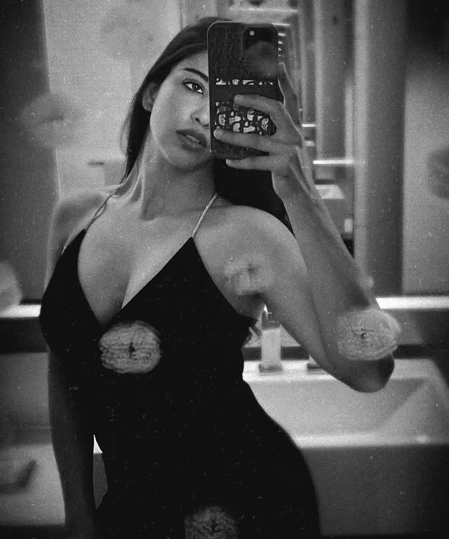 Her career gained momentum with youthful roles in Hushaaru (2018), the zombie-comedy hit Zombie Reddy (2021), a glamorous item song in Bangarraju (2022), Ravanasura (2023) opposite Ravi Teja, and the recent SWAG (2024).In this captivating photo, Daksha exudes sensuality and confidence, standing in a form-fitting short white dress by sheer curtains, back to the camera with one hand in her flowing hair, soft natural light highlighting her toned figure.