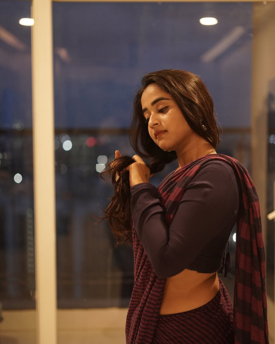Deepthi Sunaina once again captured everyone’s attention with her recent Instagram post where she is seen walking along the beach with a horse beside her. She is dressed in a graceful black saree paired with a matching blouse and antique jewelry.