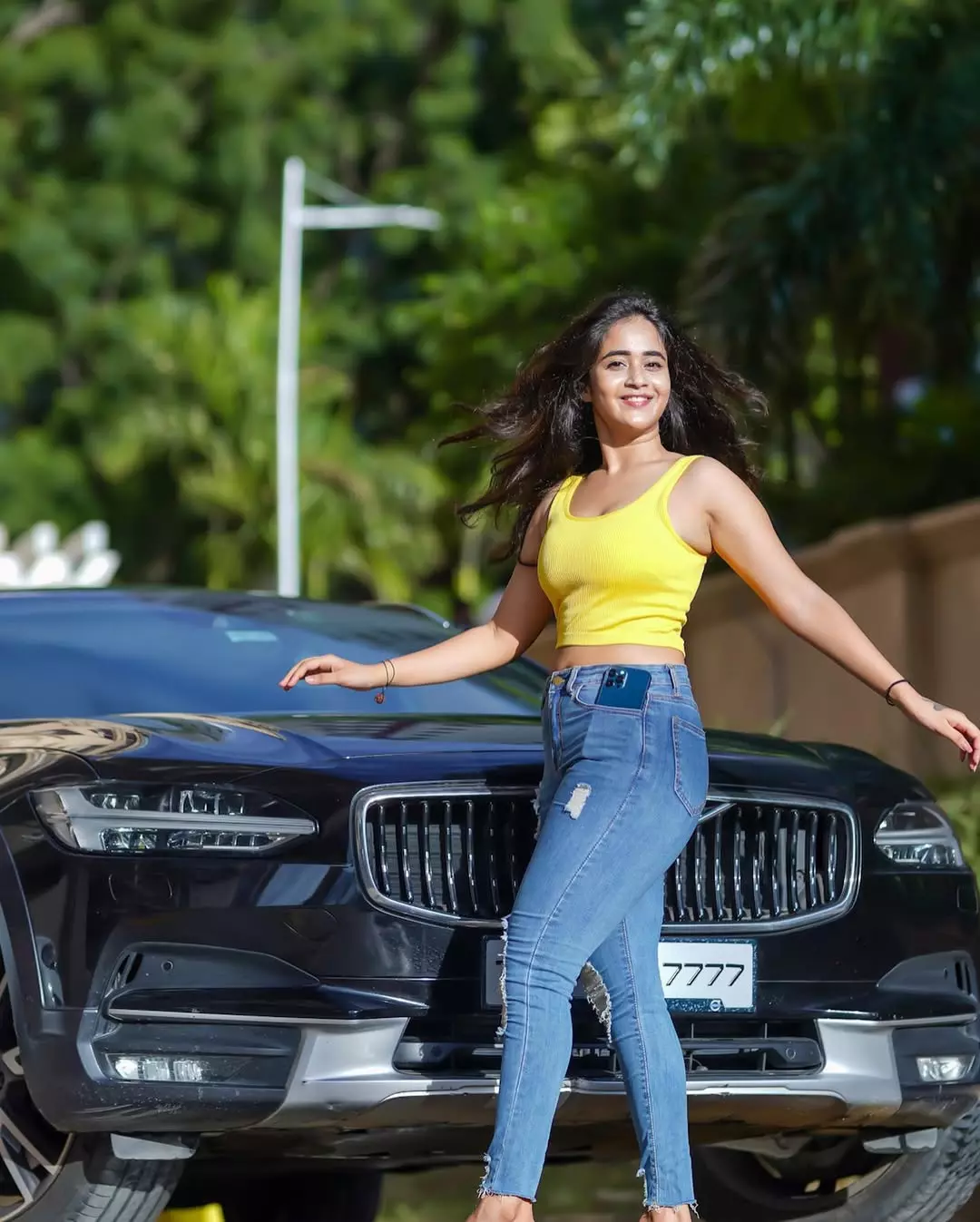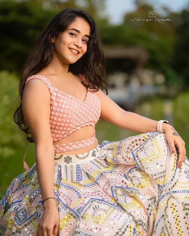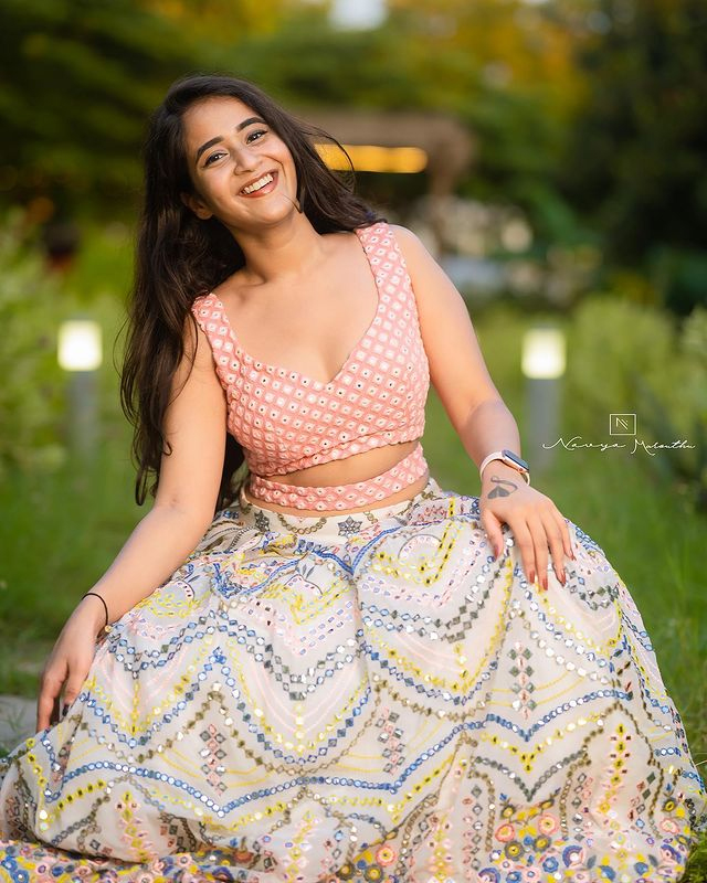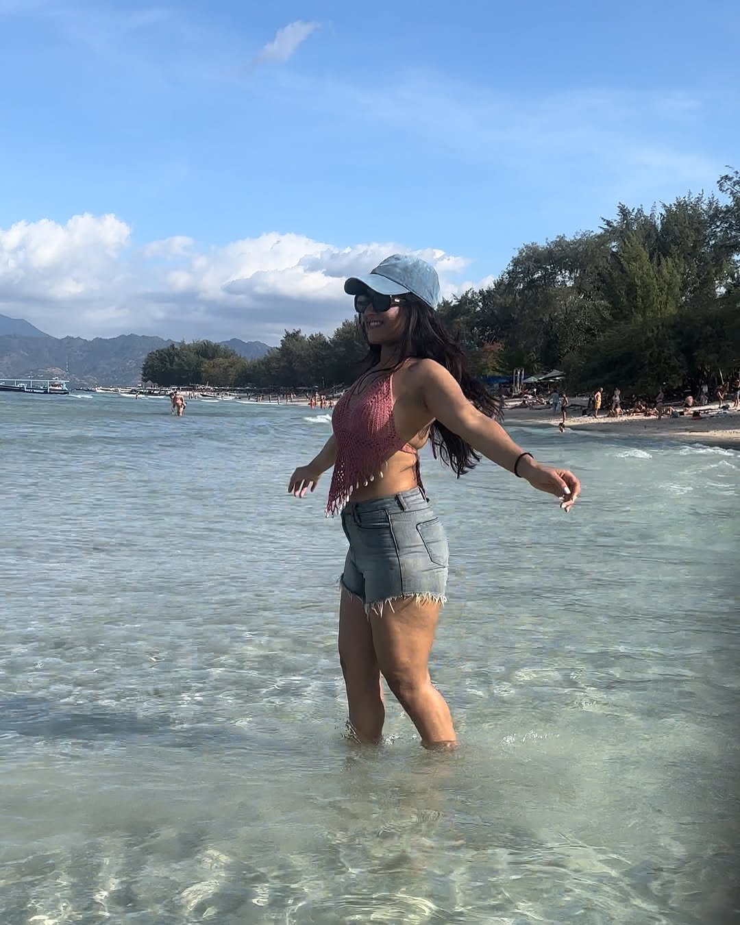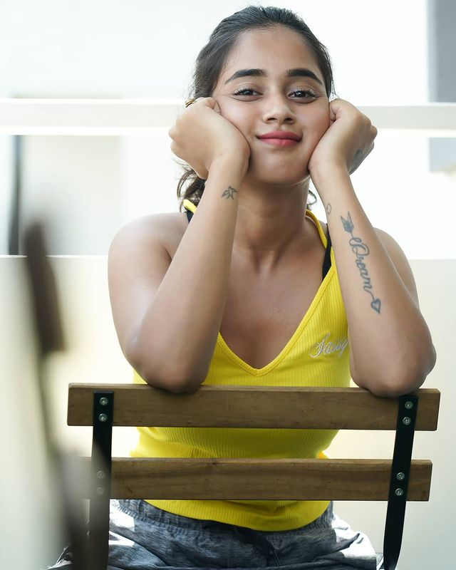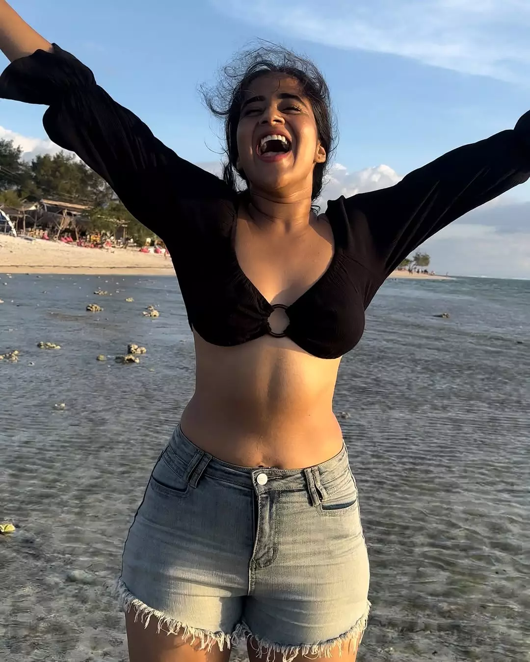 Deepti Sunaina radiates pure joy and carefree energy in her vibrant photo collections, especially this lively beach snapshot where she strikes a celebratory pose with arms raised, laughing freely against a golden sunset sky. Dressed in a black crop top with a ring detail, high-waisted frayed denim shorts, and windswept hair, she embodies beachy, youthful glamour amid Bali-like shores, palm trees, and distant crowds—perfectly capturing her fun-loving, relatable vibe that has amassed millions of followers on Instagram.