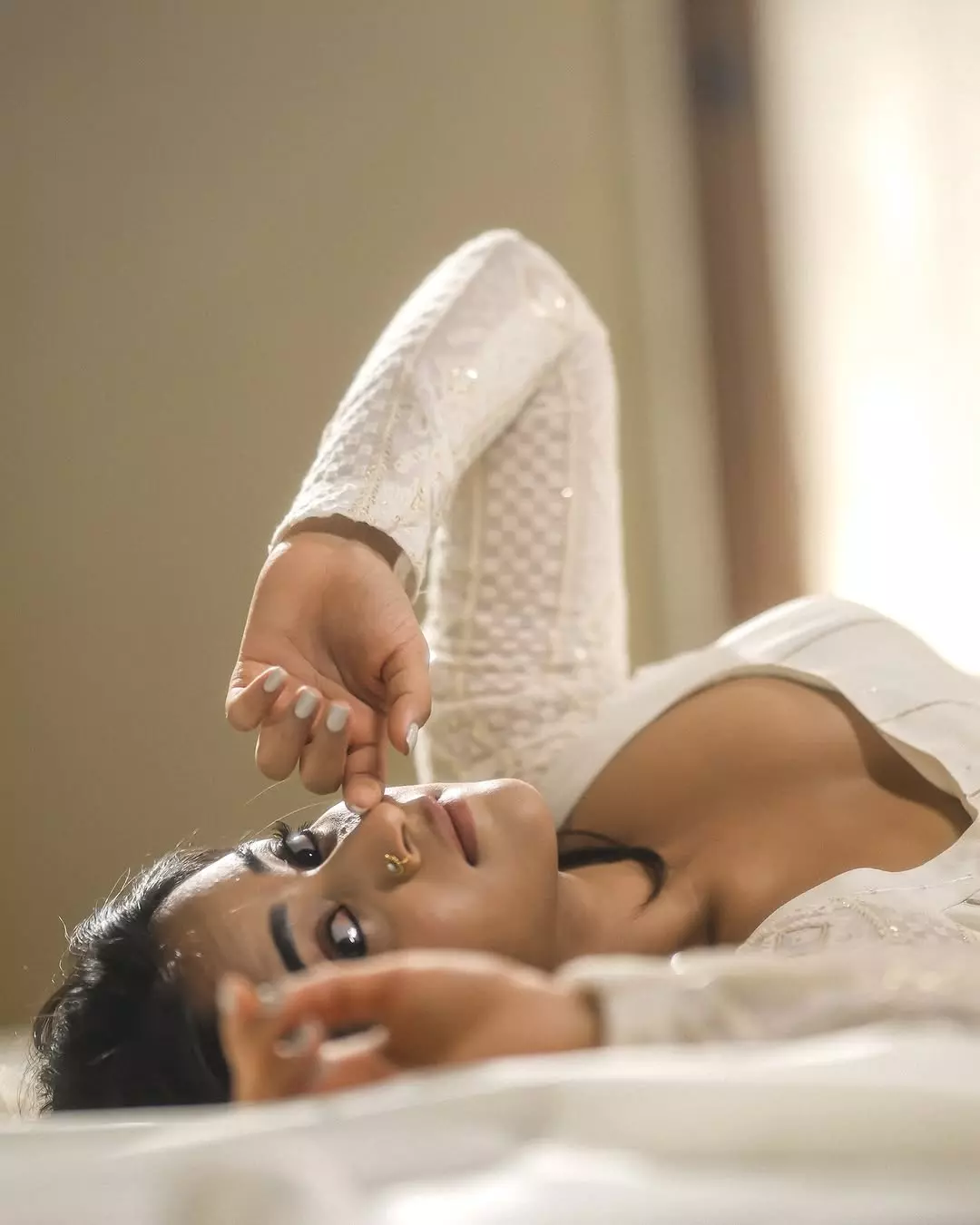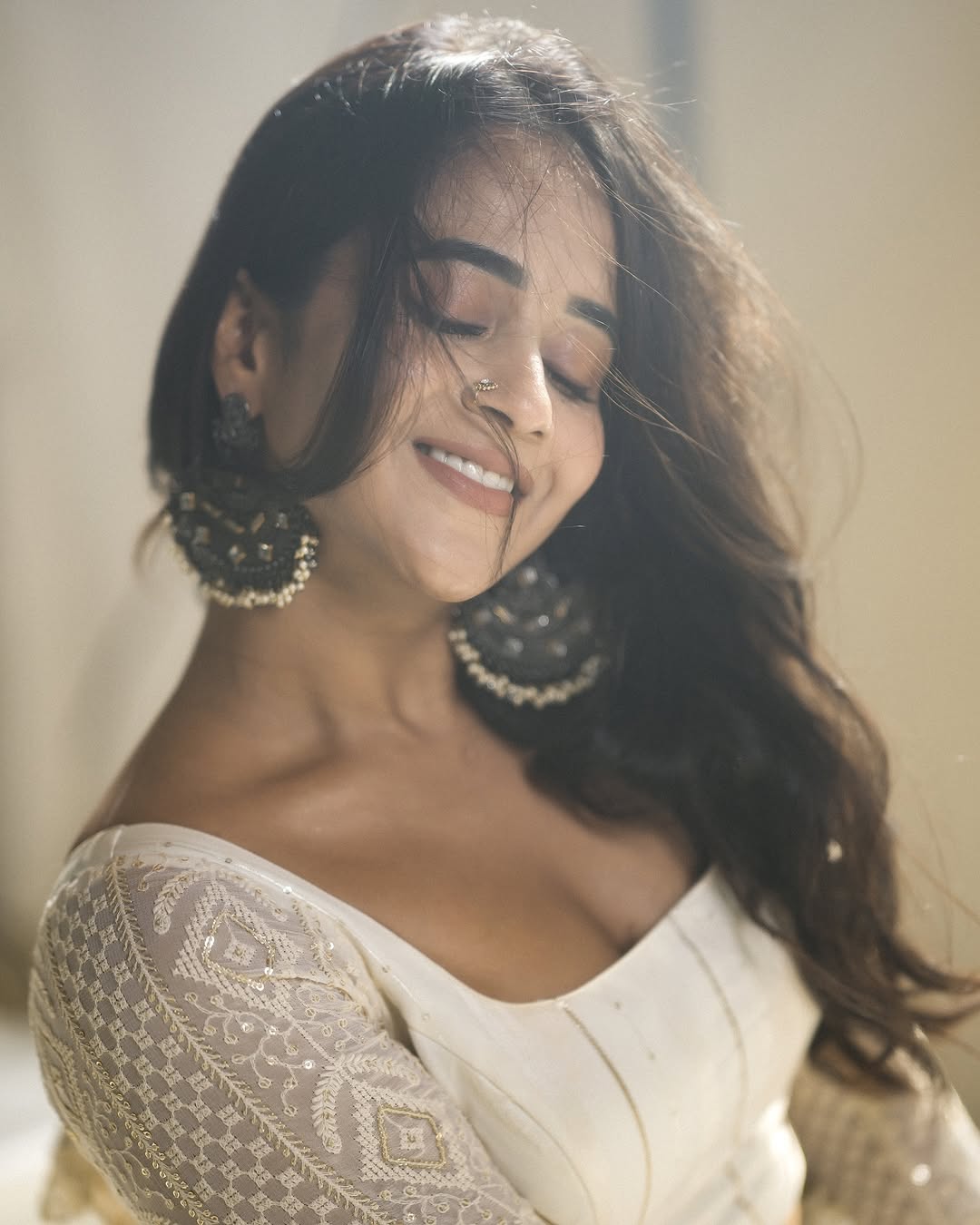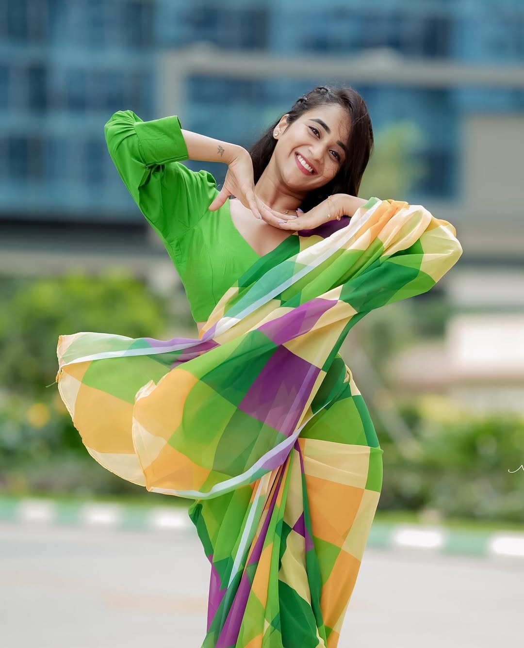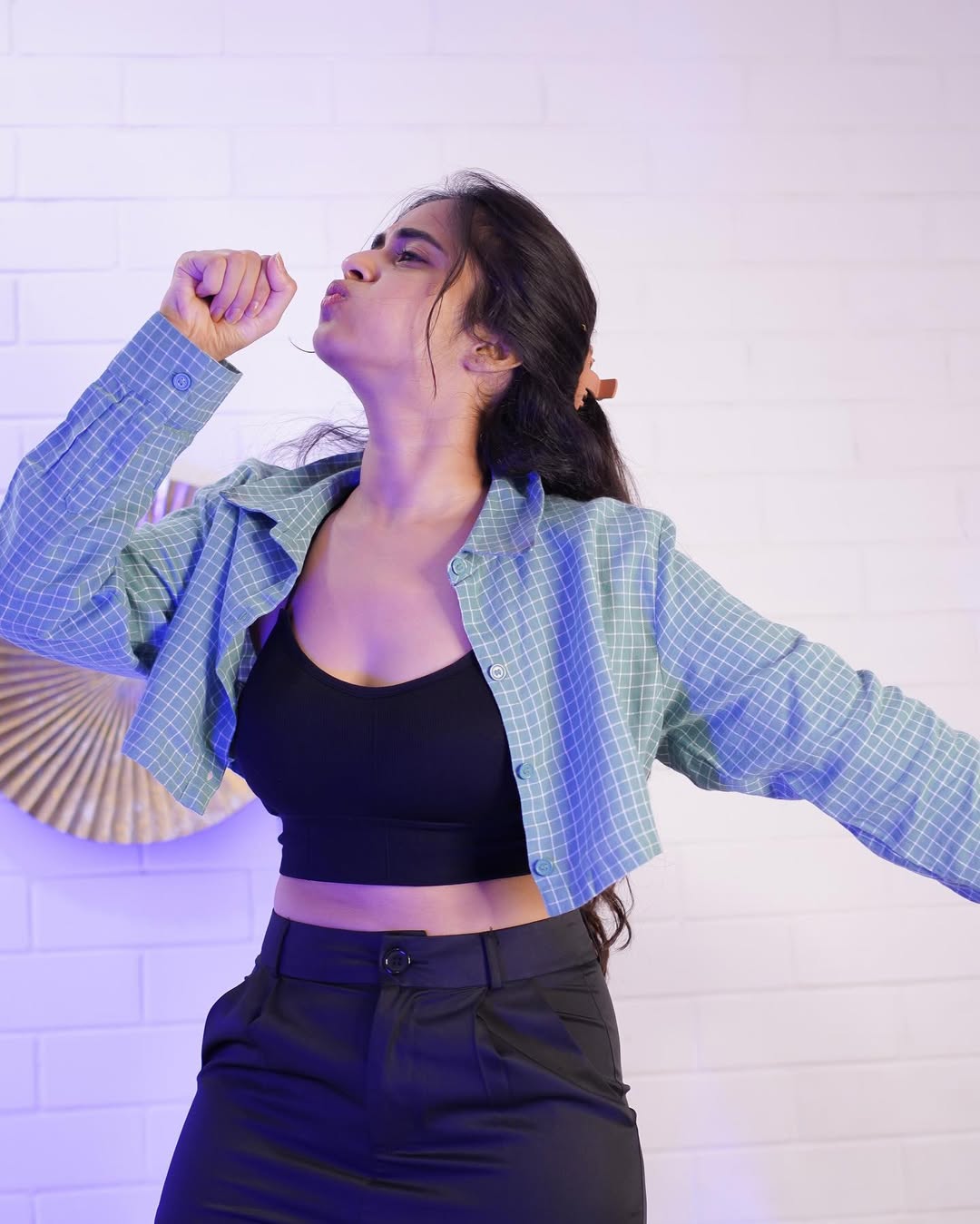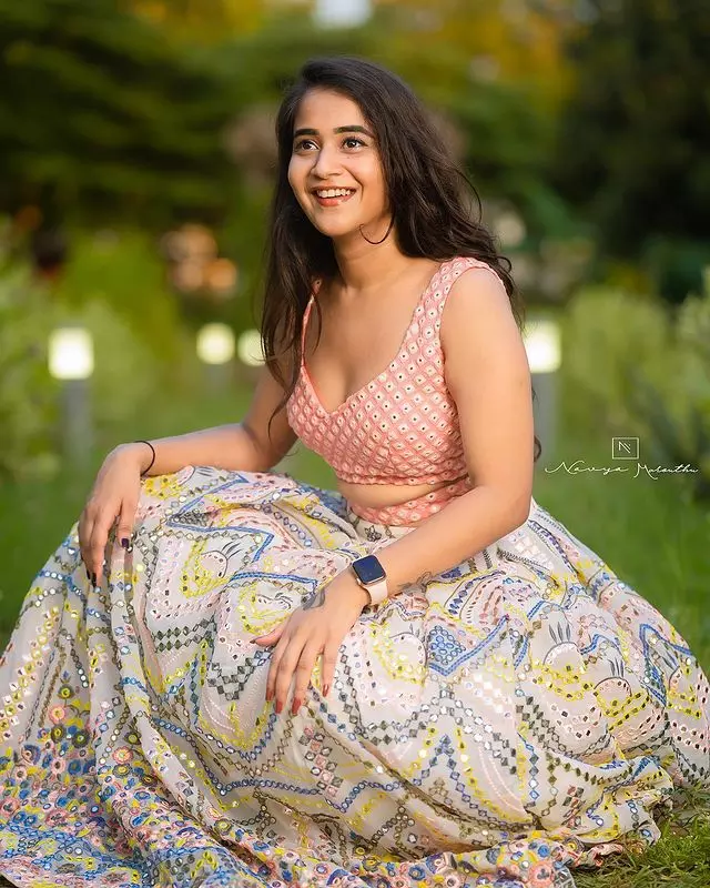 Deepti Sunaina radiates pure joy and carefree energy in her vibrant photo collections, especially this lively beach snapshot where she strikes a celebratory pose with arms raised, laughing freely against a golden sunset sky. Dressed in a black crop top with a ring detail, high-waisted frayed denim shorts, and windswept hair, she embodies beachy, youthful glamour amid Bali-like shores, palm trees, and distant crowds—perfectly capturing her fun-loving, relatable vibe that has amassed millions of followers on Instagram.
