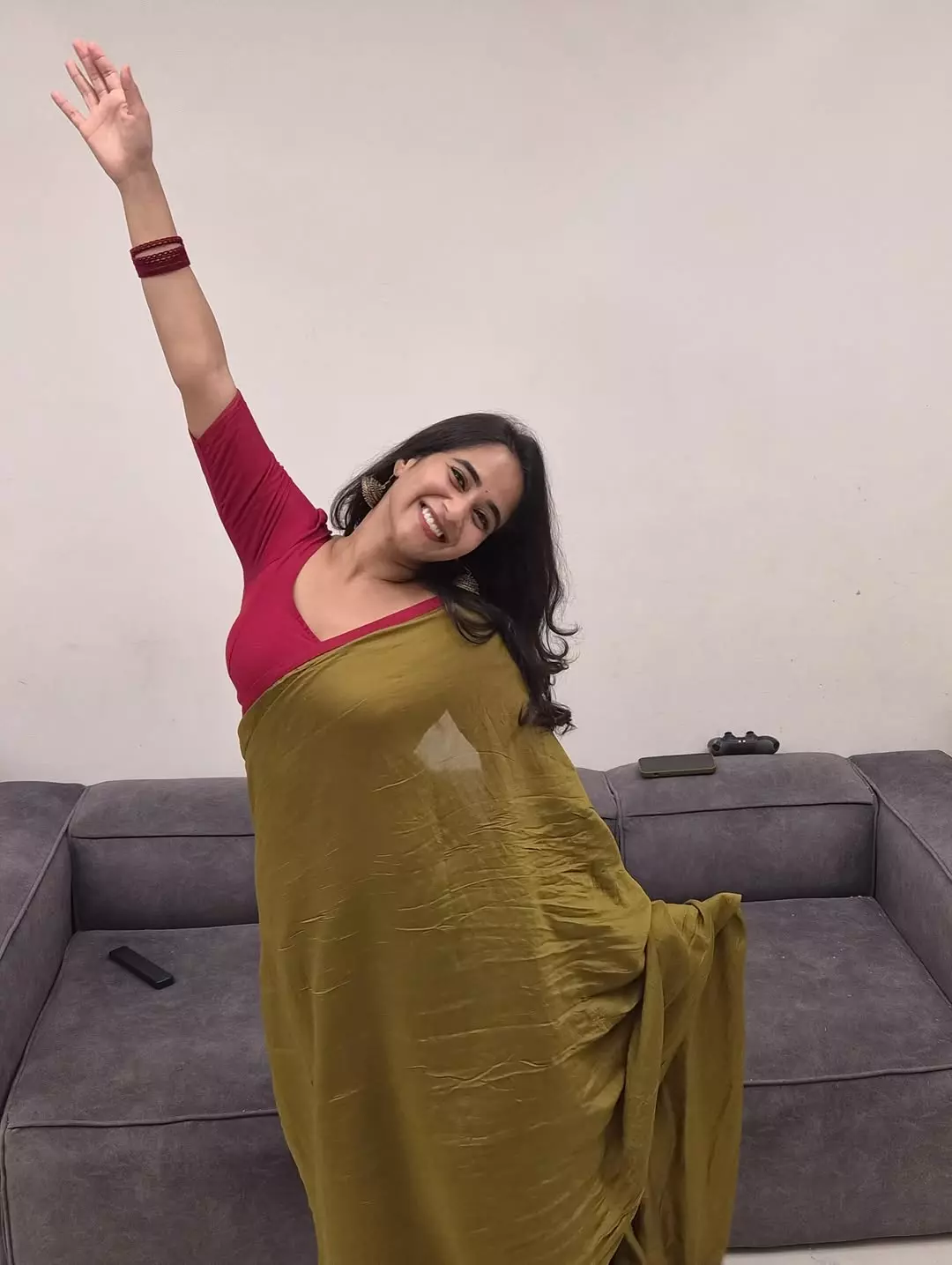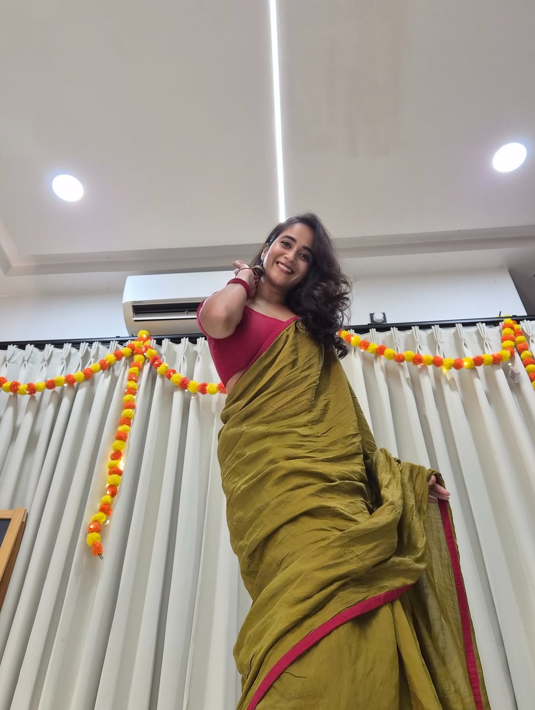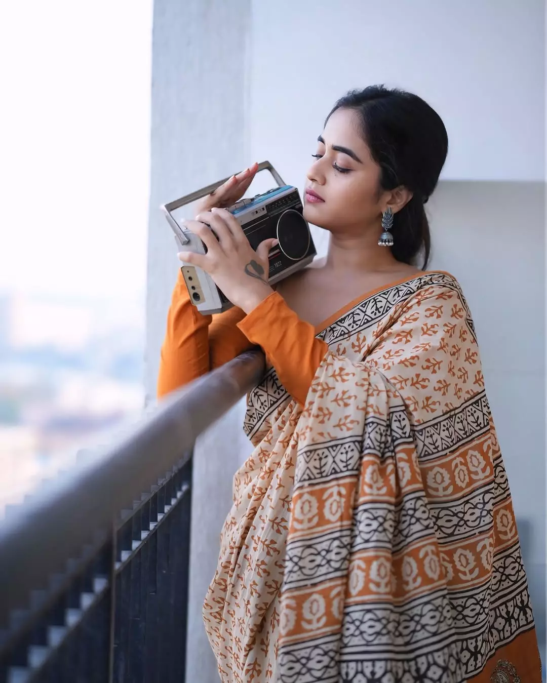 Deepthi Sunaina steals hearts in biscuit shade saree