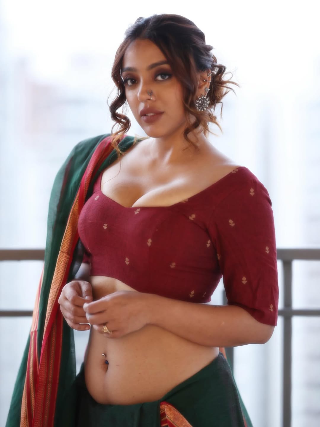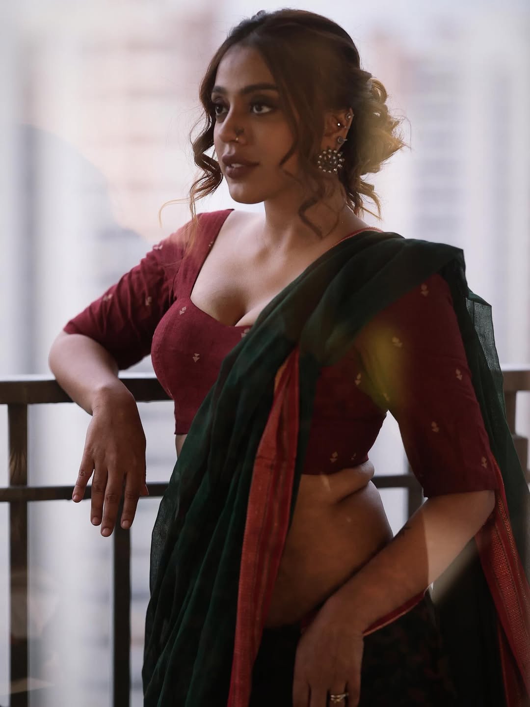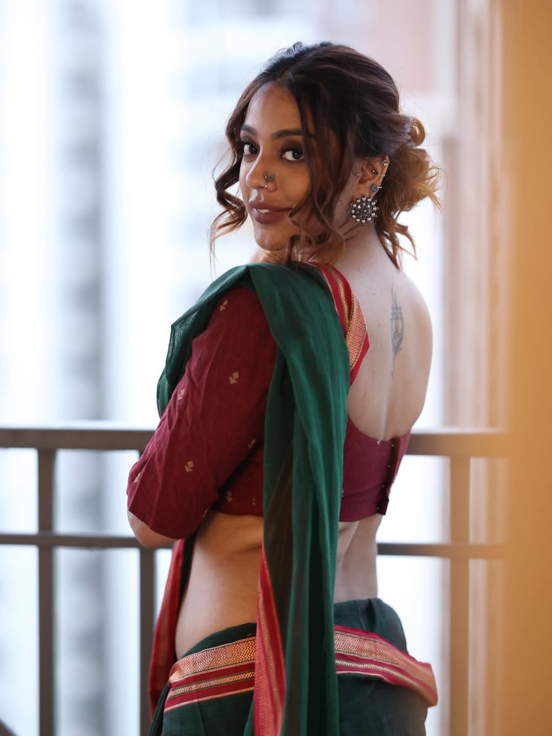 By: Tupaki Gallery Desk | 16 April 2026 10:18 AM ISTDeviyani Sharma (Instagram: @VDeviyaniSharma) mesmerizes in this bold and elegant saree look, exuding confidence with a deep maroon blouse paired with a rich green saree. She captioned the striking photo: “A little mystery, a lot of magic.”