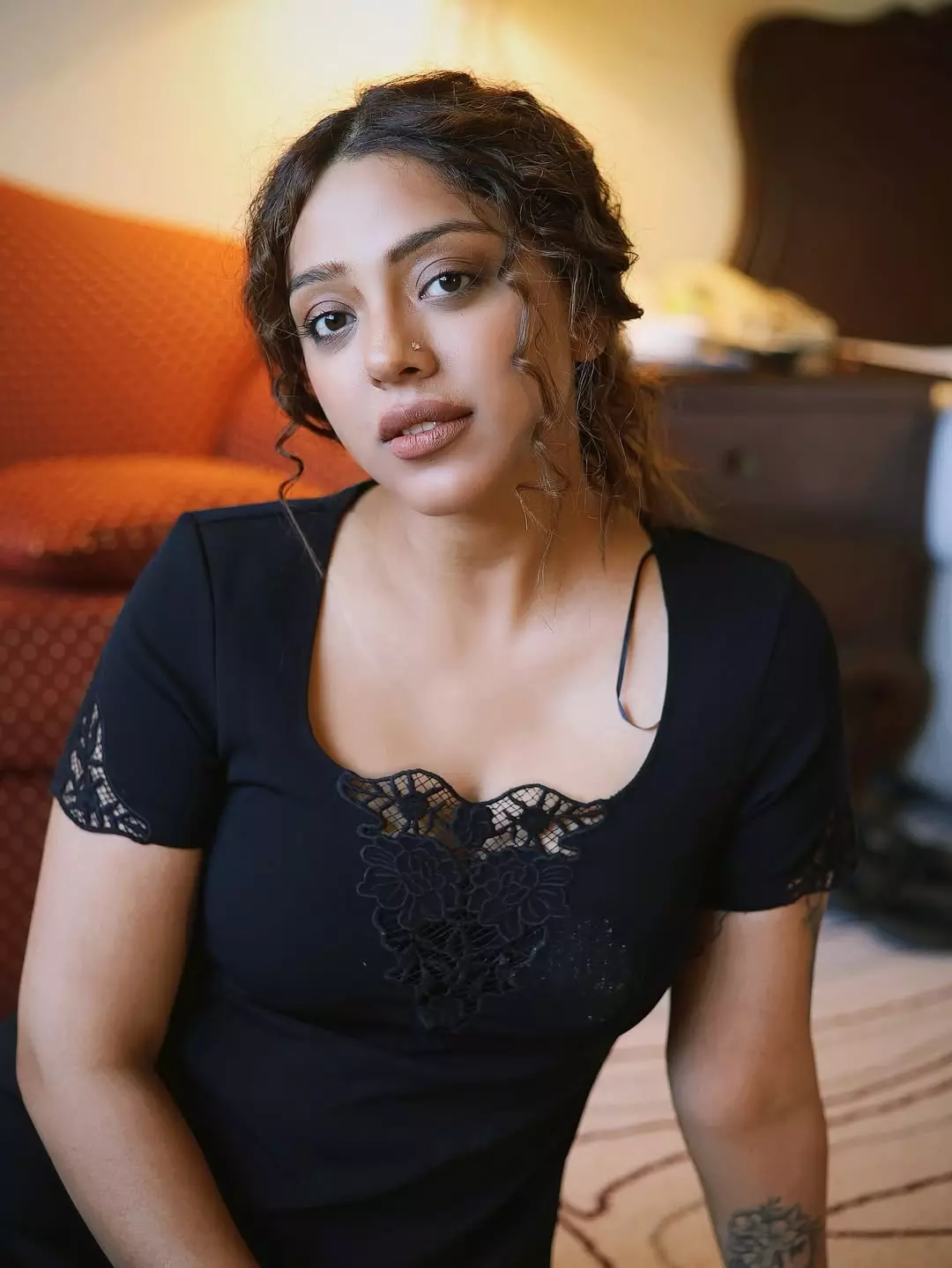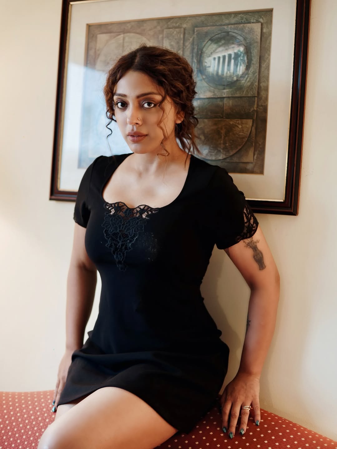 In the picture, Devyani wore a black dress with lace detail. She is seen sitting near a wall with a framed artwork behind her. Her hair was styled in a soft updo with a few curls falling to frame her face.
