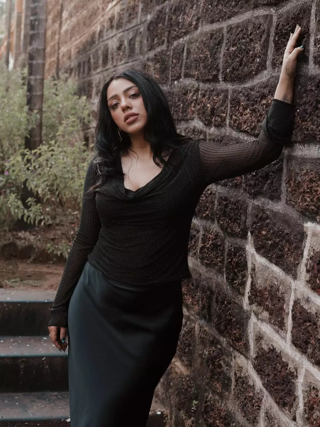 Recently, Deviyani shared a stylish photo on Instagram. In the picture, she is seen standing beside a stone wall, dressed in a dark, elegant dress giving a calm and confident pose.