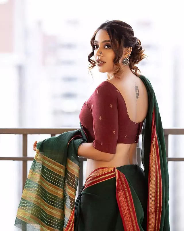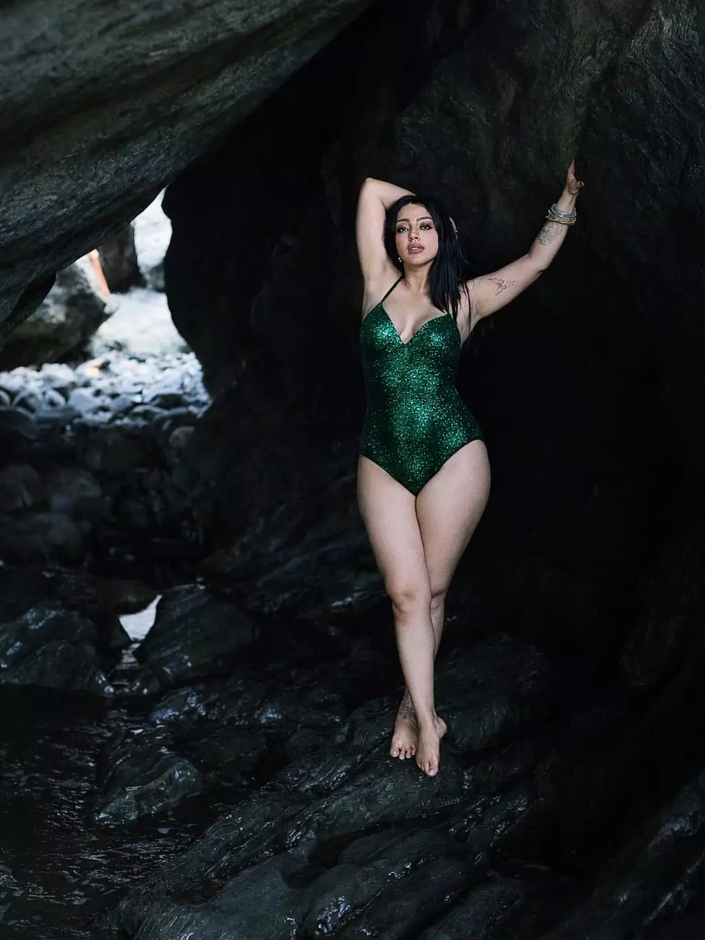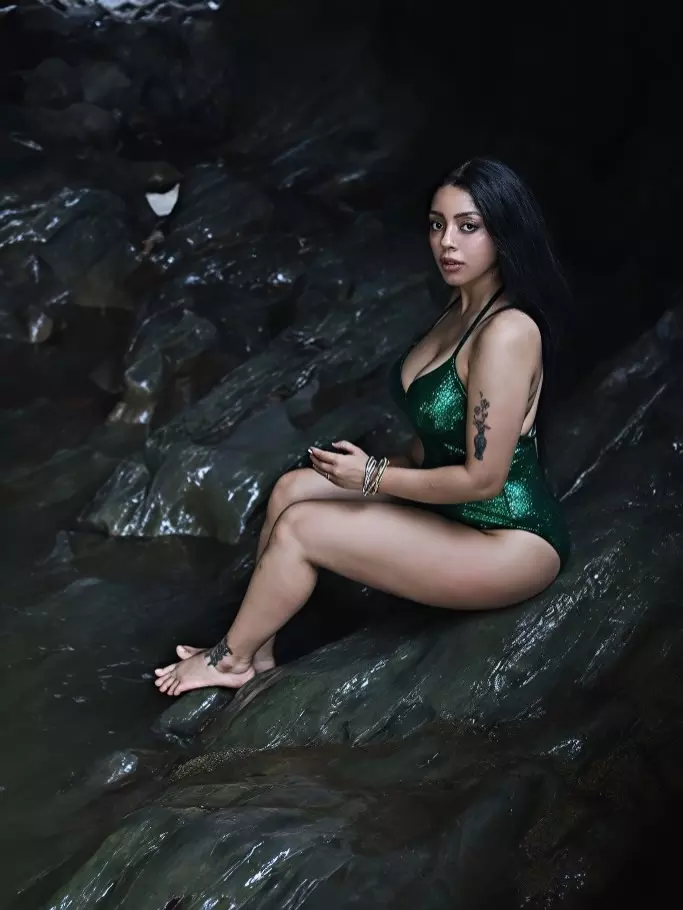 In this captivating frame, Deviyani Sharma poses confidently against a dramatic rocky backdrop, wearing a shimmering green outfit that perfectly highlights her bold and modern fashion sense. The natural setting, combined with the moody lighting, adds depth to the image and creates a visually stunning composition. Her confident posture and intense expression bring a powerful energy to the photograph, making it stand out instantly.