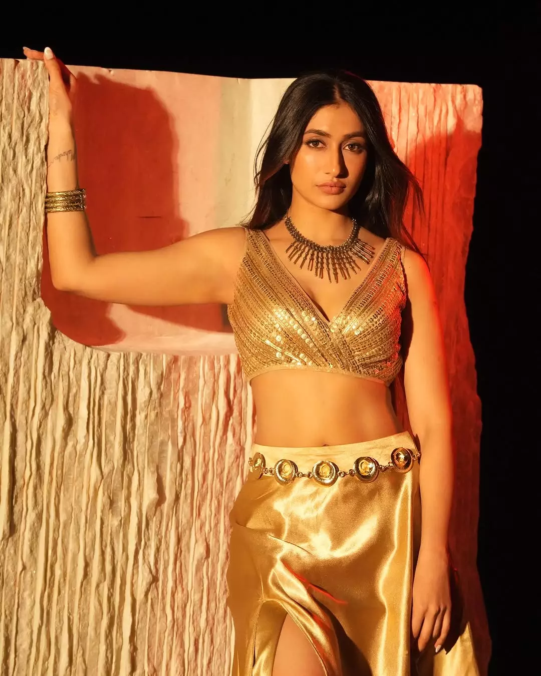 Dhanashree Verma radiated ethereal elegance in a shimmering silver sequined saree, her sculpted silhouette accentuated by the deep V-neck blouse and high-waist drape. With a gentle glow illuminating her confident pose against the dimly lit backdrop of floral arrangements and warm interiors, she embodied grace and glamour. Sculpted silhouette, gentle glow