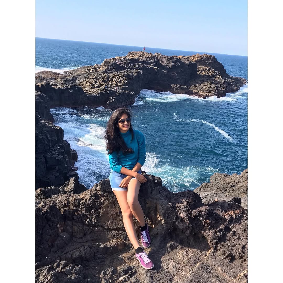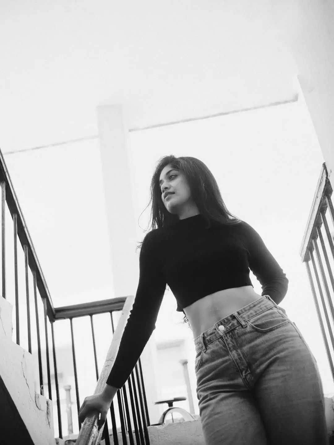 Dheera Pisati, the radiant Miss Hyderabad of 2016, enchants in this breathtaking outdoor portrait, where she stands poised on a sun-drenched balcony overlooking lush green lawns and swaying palm trees