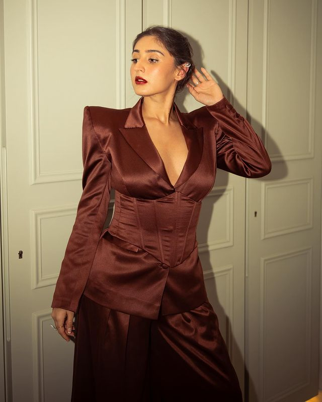 The minimal yet classy outfit accentuated her graceful frame, while her subtle makeup with nude tones and softly tied-back hair added a natural charm. Dhvani accessorized with dainty gold jewelry and a couple of chic rings, keeping the focus on her outfit and radiant personality.