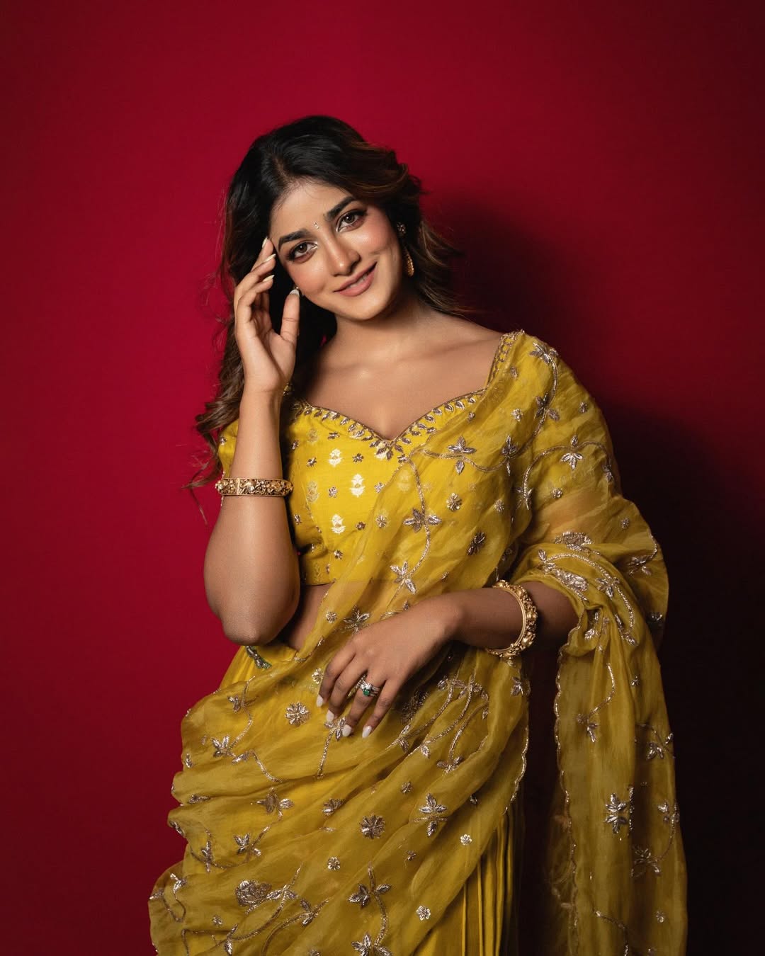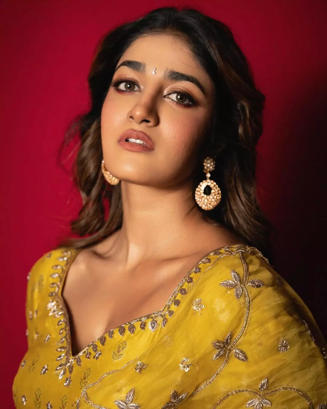 Known for her glamorous screen presence and graceful dance moves, Dimple has also ventured into Hindi cinema with Atrangi Re. In this stunning portrait, she exudes traditional elegance in a vibrant yellow saree with intricate gold embroidery, set against a bold red backdrop, complemented by ornate earrings and a subtle bindi.