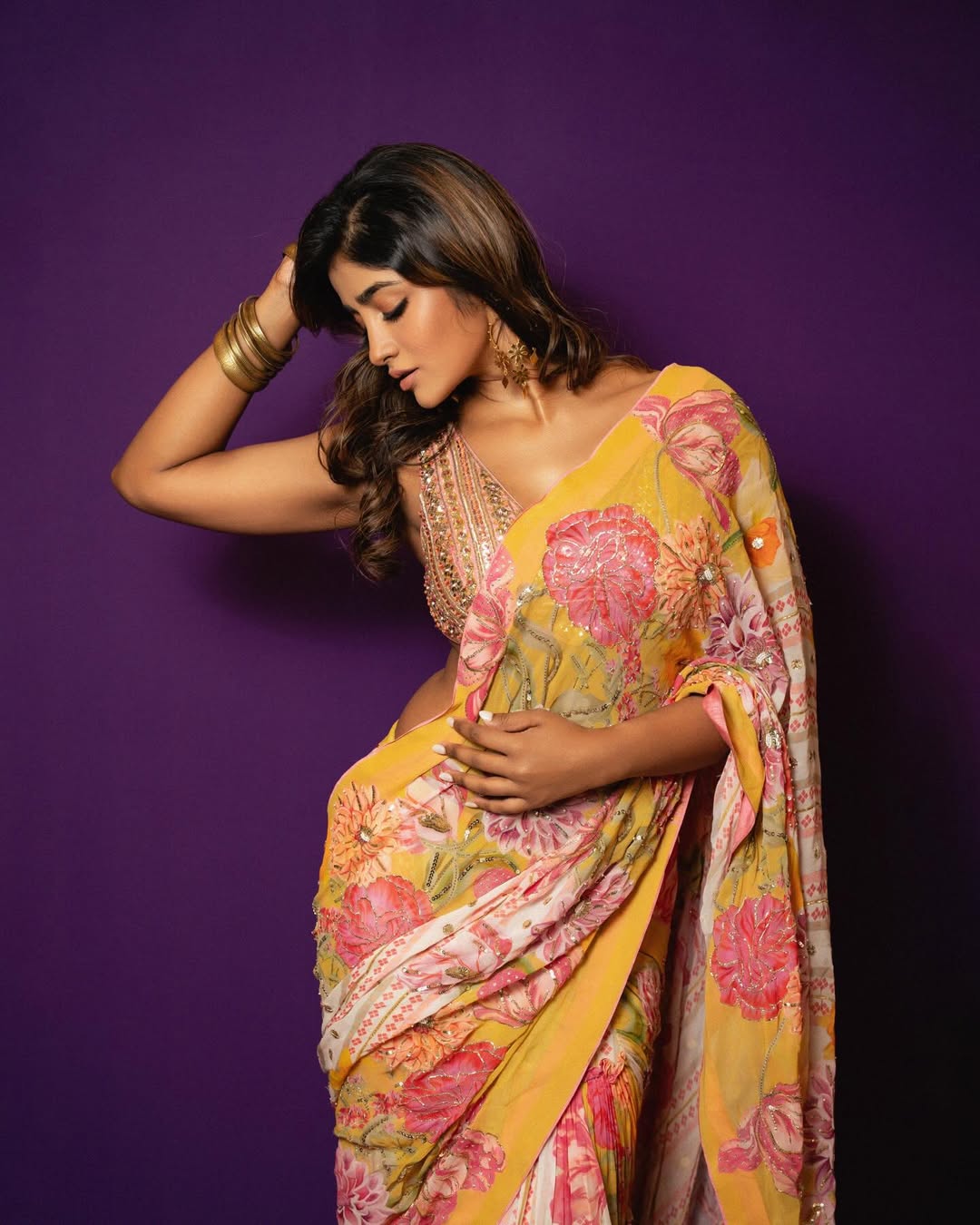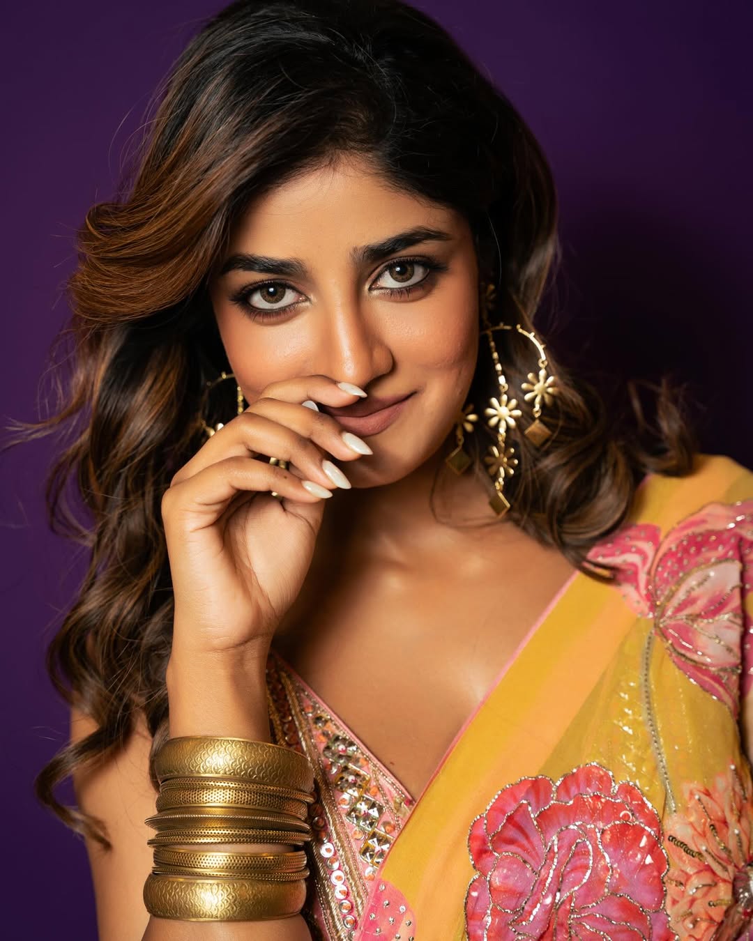 By: Tupaki Desk | 4 Jan 2026 11:07 AM ISTSouth Indian beauty Dimple Hayathi enchants fans with her latest captivating photo, radiating joy and elegance. Dressed in a vibrant yellow saree adorned with intricate pink floral embroidery, sequins, and golden accents, she pairs it with elaborate gold chandelier earrings. Her wavy hair cascades softly, makeup flawless with glowing skin and a beaming smile, set against a rich purple backdrop that highlights her timeless charm.