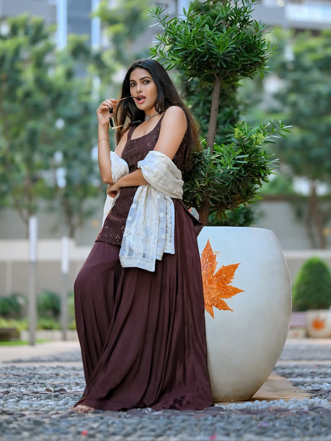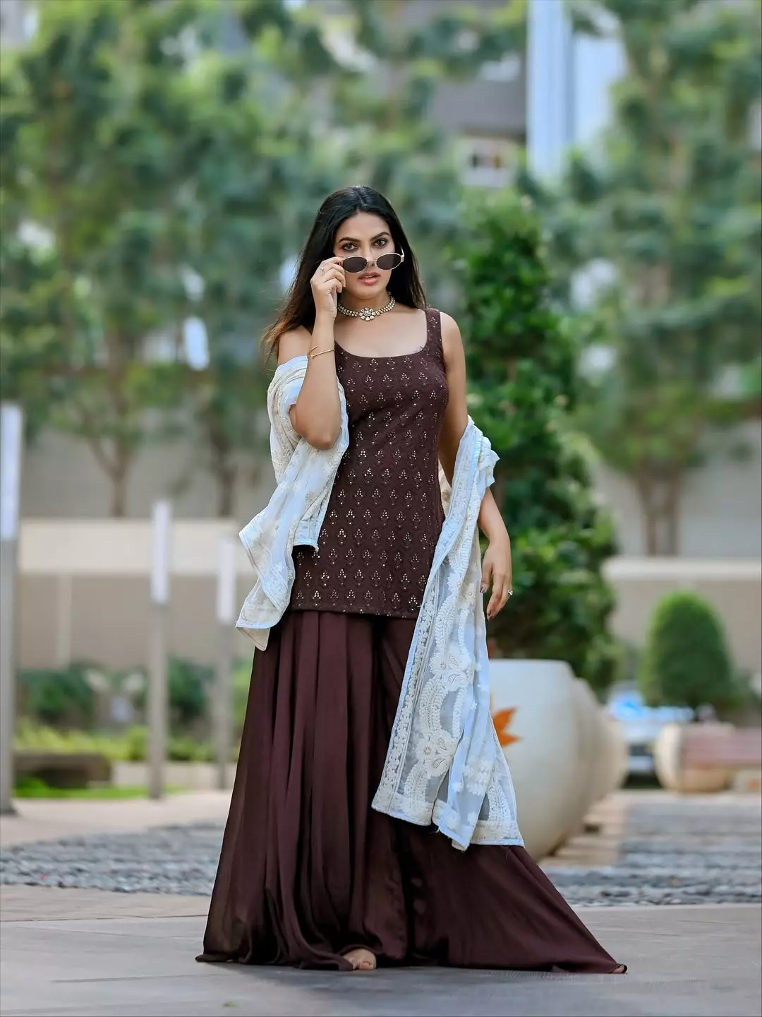 Actress Divi captivates hearts once again with her effortlessly elegant style and confident charm. In her latest look, she stuns in a deep maroon embroidered ethnic outfit, paired beautifully with a white embellished dupatta. The subtle shimmer of the fabric highlights her poised demeanor, while her chic round sunglasses and statement pearl choker add a touch of contemporary flair. Divi’s overall look perfectly blends traditional beauty with a modern twist, reflecting her bold yet graceful personality.