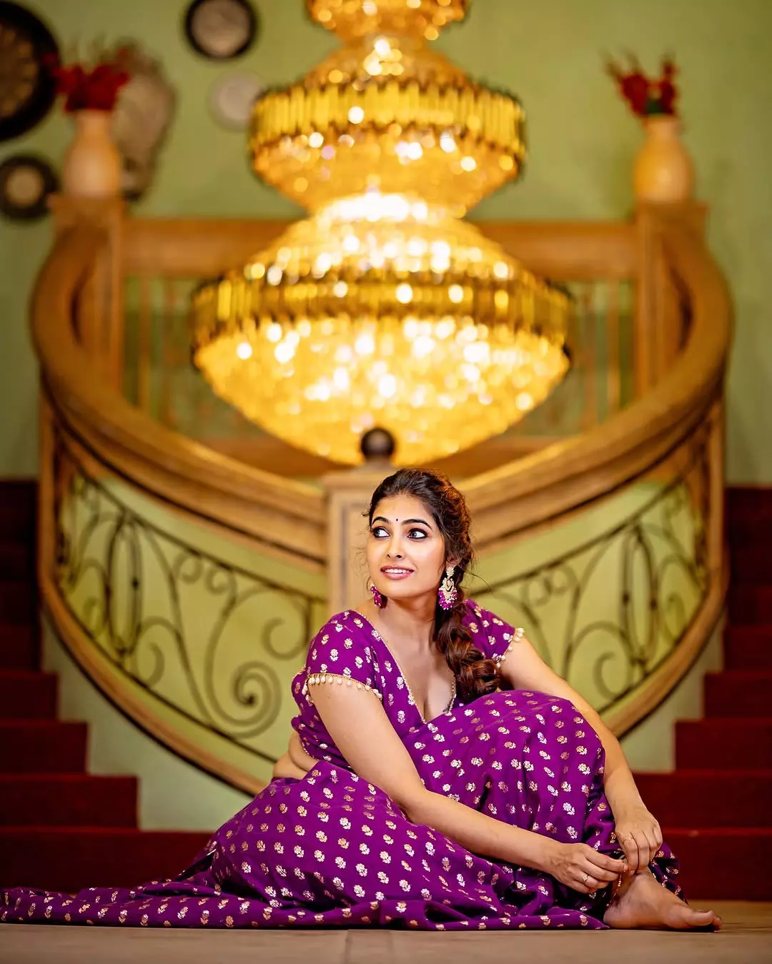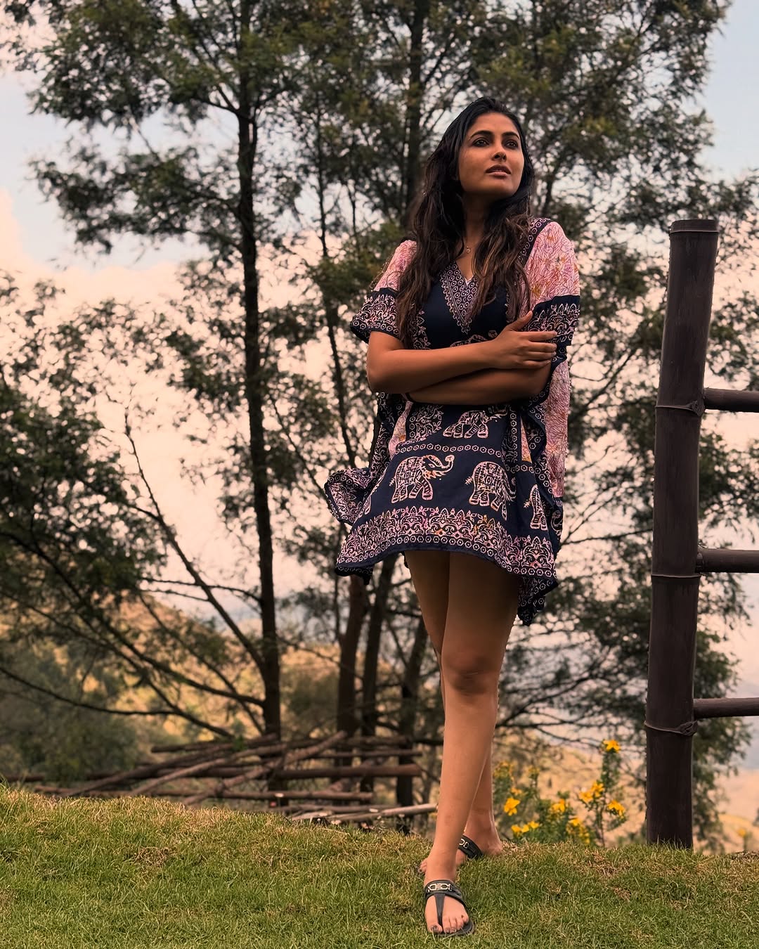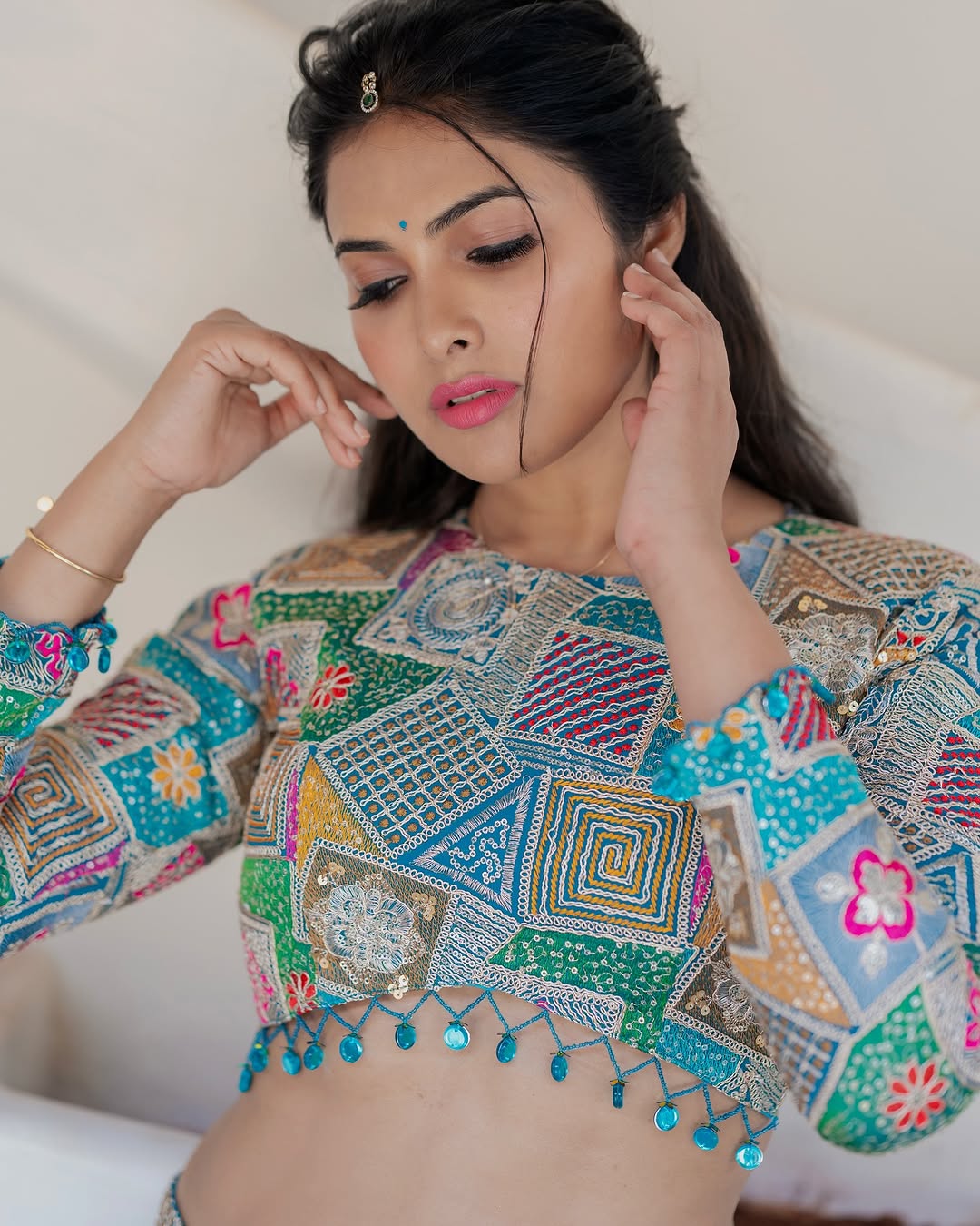 Her latest Instagram picture captures her in a traditional blue lehenga. The long skirt flows beautifully. The full sleeved blouse has colorful embroidery. Small bead details add charm to the look. She pairs it with a delicate hair accessory. Her smile enhances the appeal of the picture. She credits Navya Marouthu for styling. Studios19 LSP is the photographer. Chitti Papa handles the makeup. The picture is taken at Rejoy Club Hyderabad. She adds poetic lines to the caption making the post more expressive.