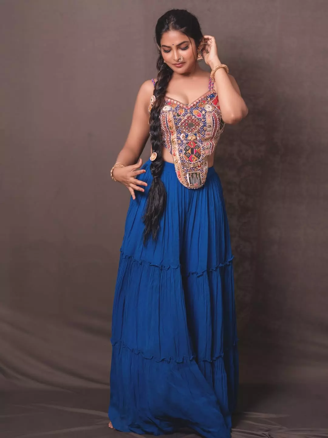 She looked graceful in a rich blue skirt paired with an embroidered blouse full of traditional mirror and beadwork. Styled by @vinnu-_baby9, the ensemble came from @aanchalsdesignerstudio and was captured beautifully by @verendar-_photography. Her makeup, done by @ramani-_penubala, added a perfect finishing touch to her artistic and powerful pose.