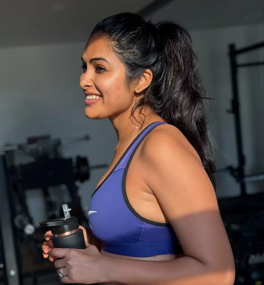 In this powerful gym photograph, Divi Vadthya showcases her dedication and toned physique as she performs a cable tricep pushdown exercise.