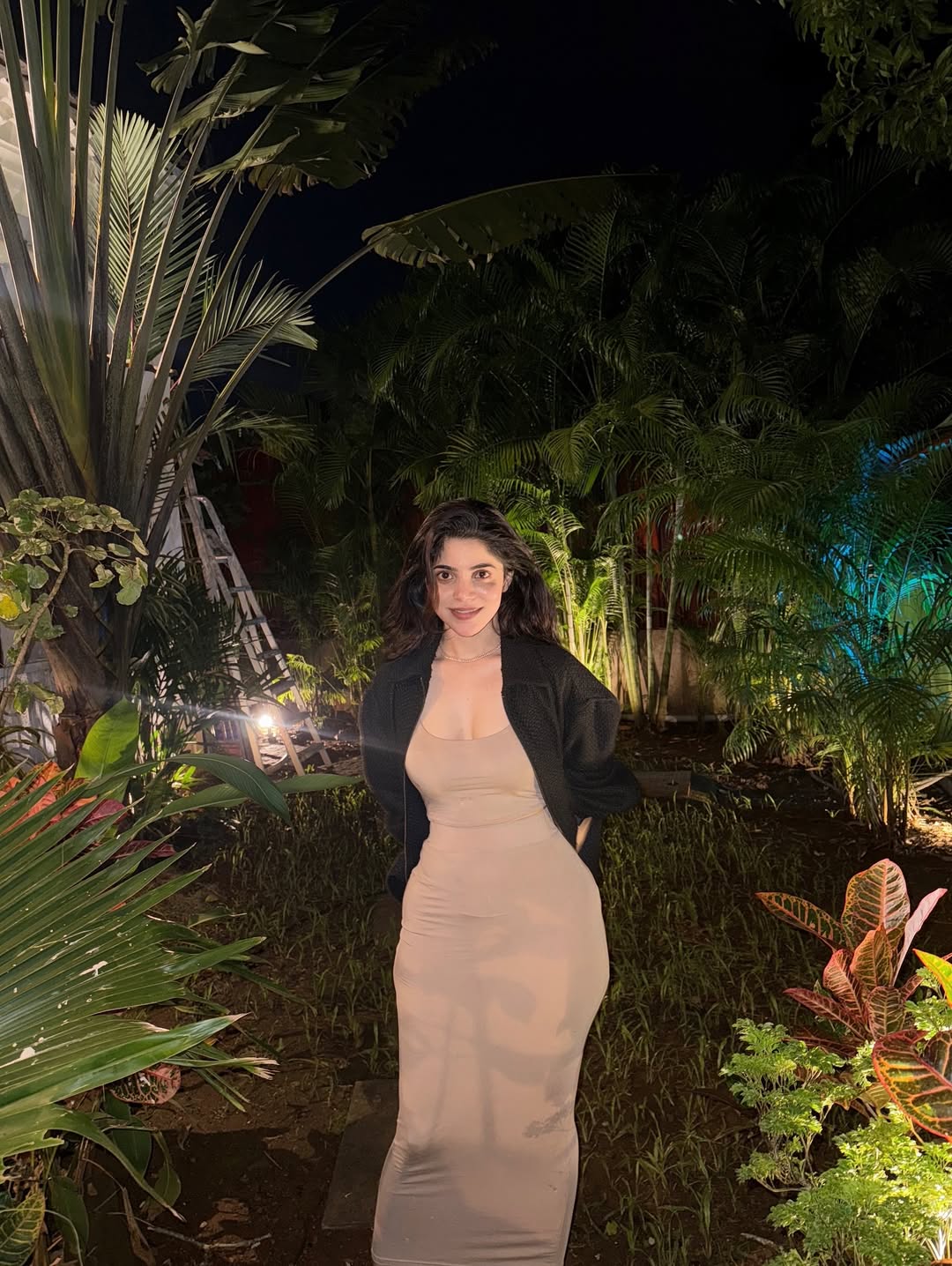 The photo of Divya Bharathi radiates elegance as she lounges on a plush sofa in a sleek, blush-toned dress, her poised demeanor illuminated by vibrant purple lights. The setting exudes a modern, chic vibe, perfectly complementing her graceful pose and long, flowing hair. With the sentiment "Let love in! ," the image captures a moment of openness and warmth, reflecting her rising charm in the entertainment industry.
