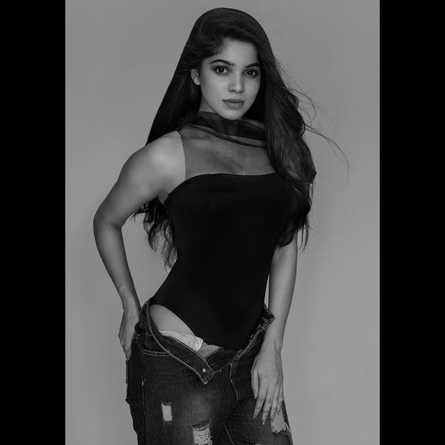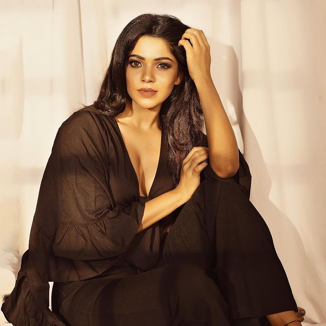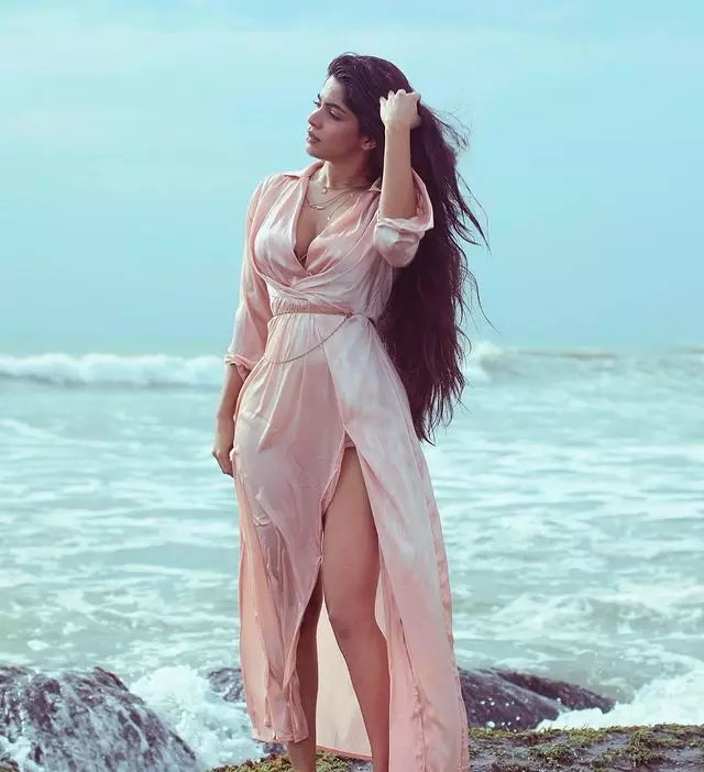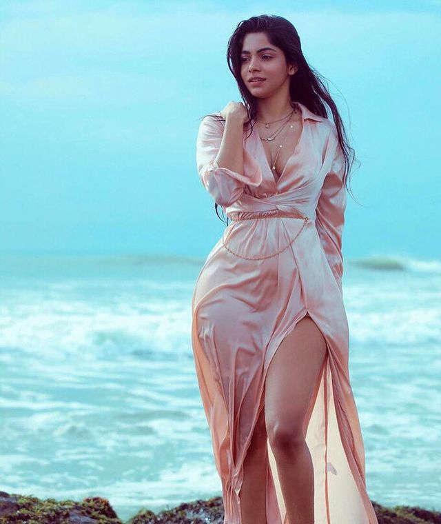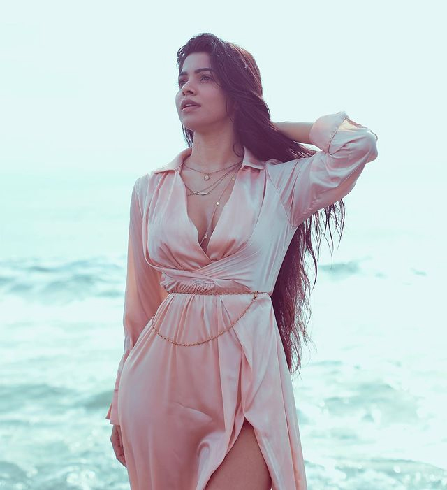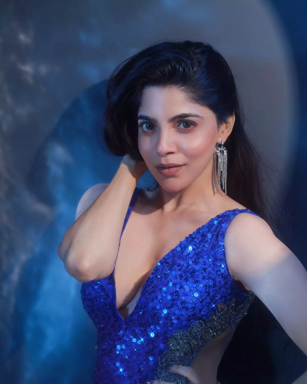 Sparkling in a deep plunging royal blue sequin gown, Divyabharathi looks mesmerizing in her latest glamorous photoshoot. With dramatic poses — one hand on her thigh and a soft gaze, the other touching her hair with intense eye contact — she channels pure elegance and confidence under moody blue lighting. She captioned the series: “Wildest dreams ”