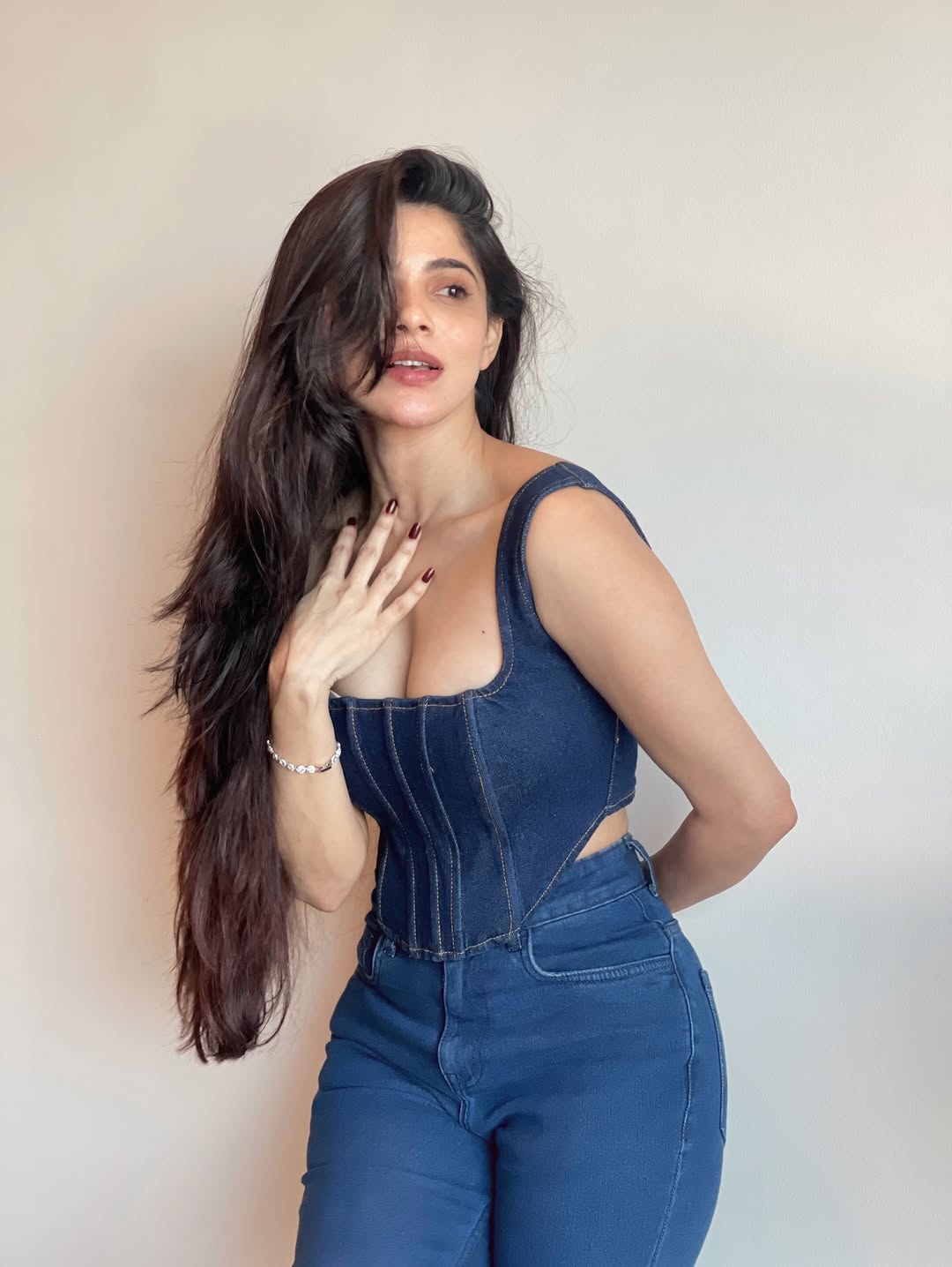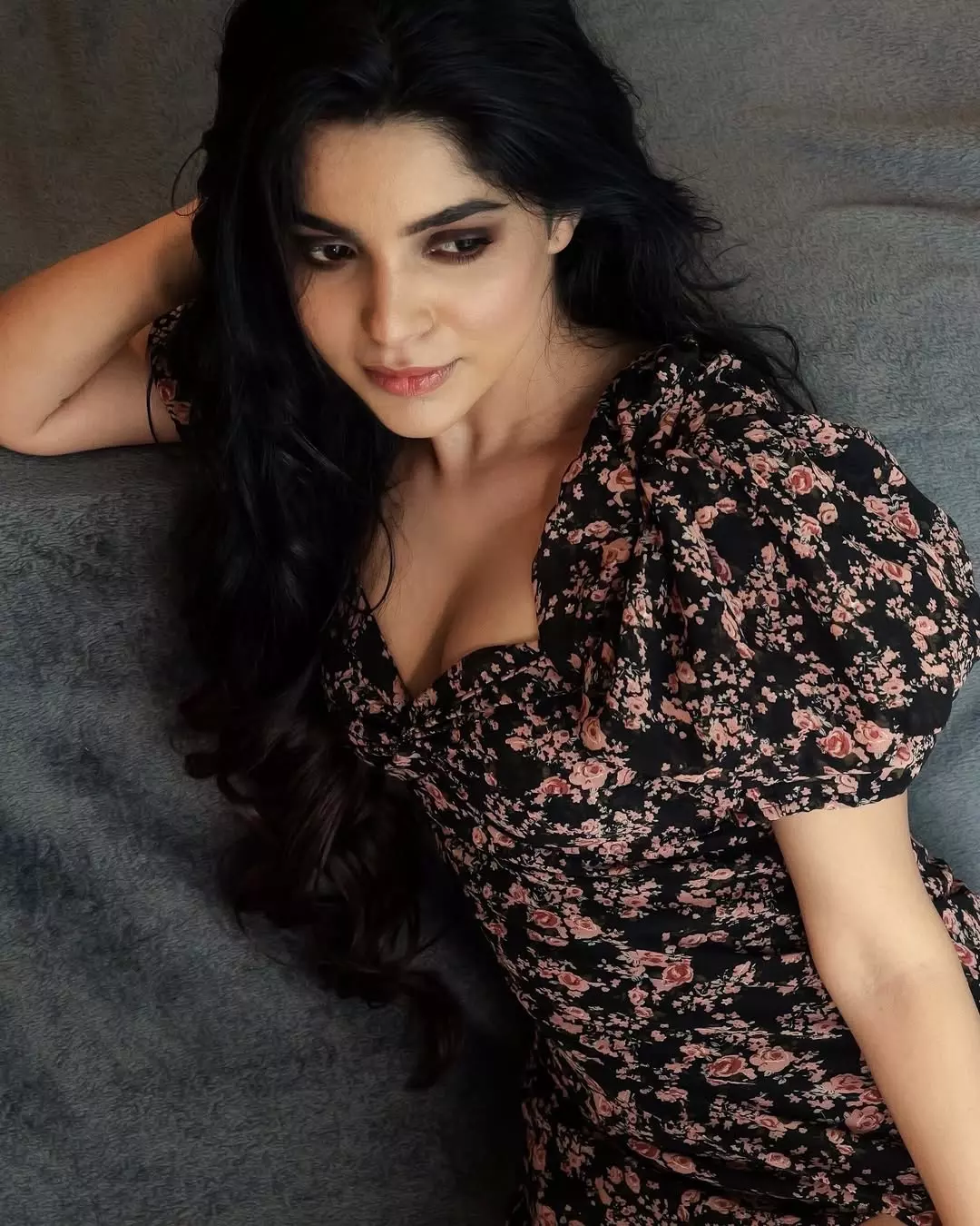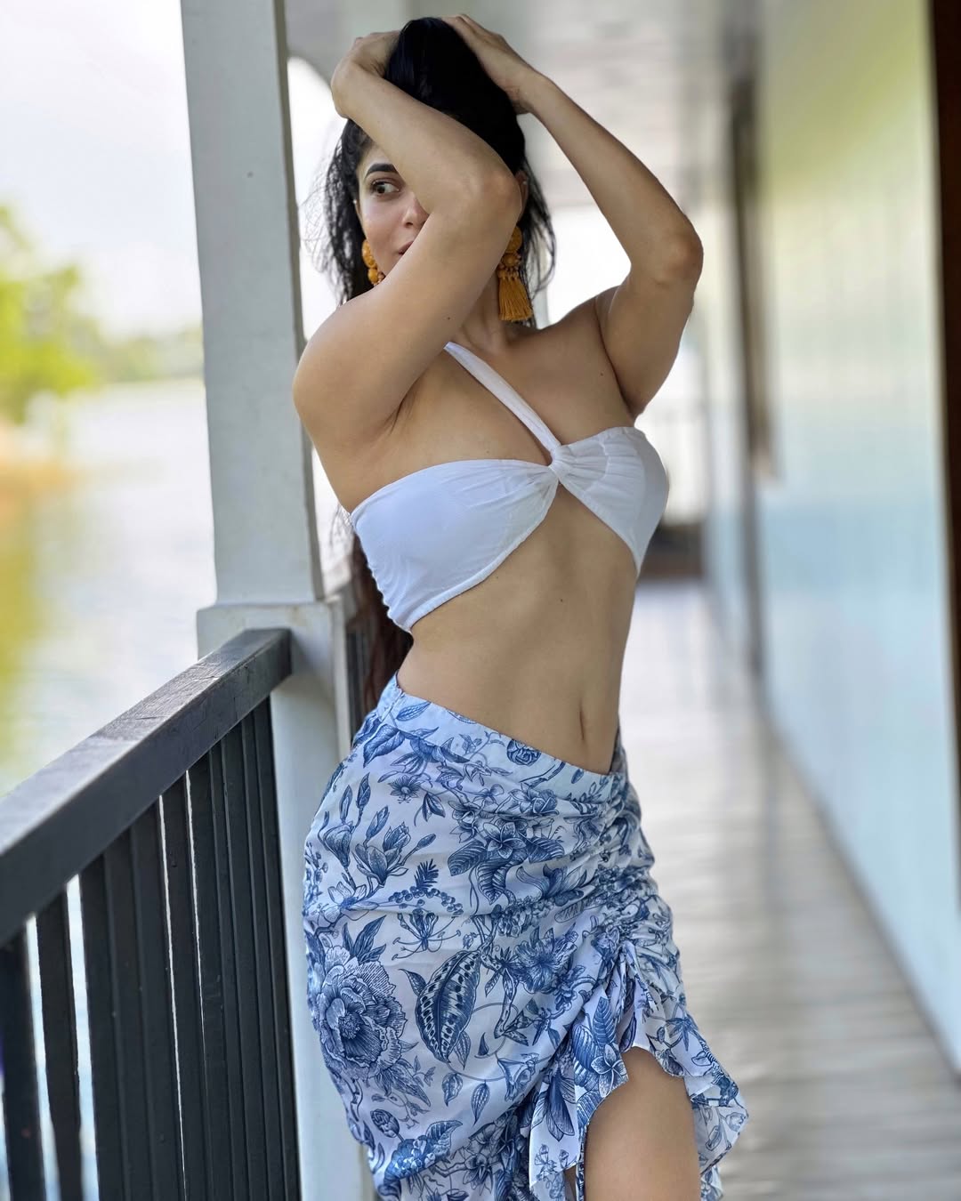 Sparkling in a deep plunging royal blue sequin gown, Divyabharathi looks mesmerizing in her latest glamorous photoshoot. With dramatic poses — one hand on her thigh and a soft gaze, the other touching her hair with intense eye contact — she channels pure elegance and confidence under moody blue lighting. She captioned the series: “Wildest dreams ”