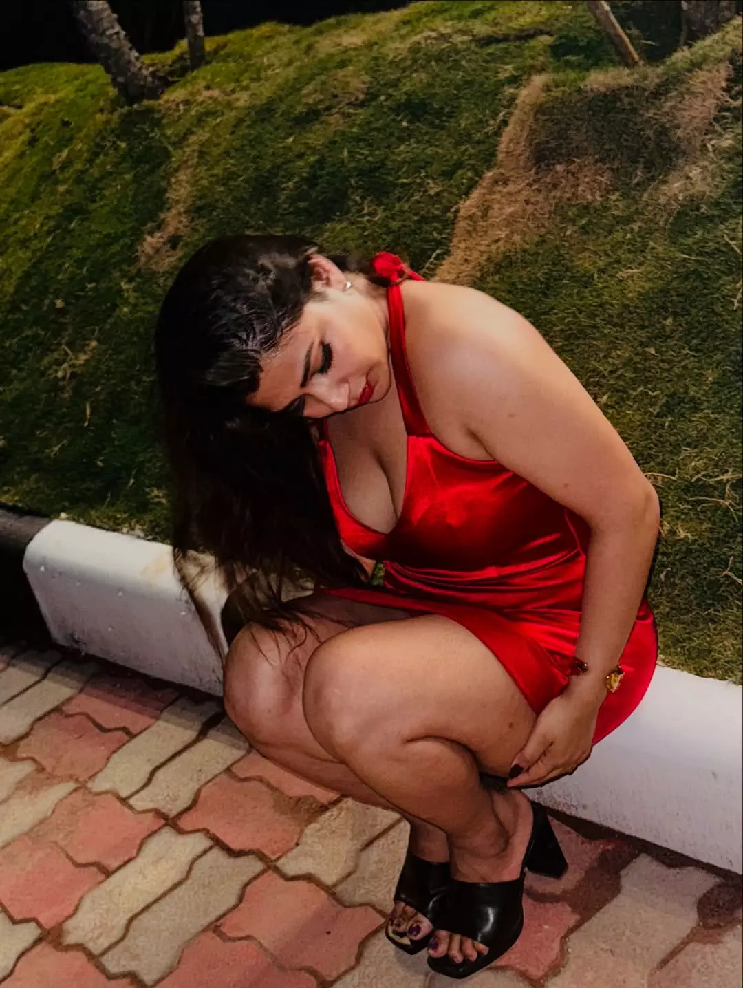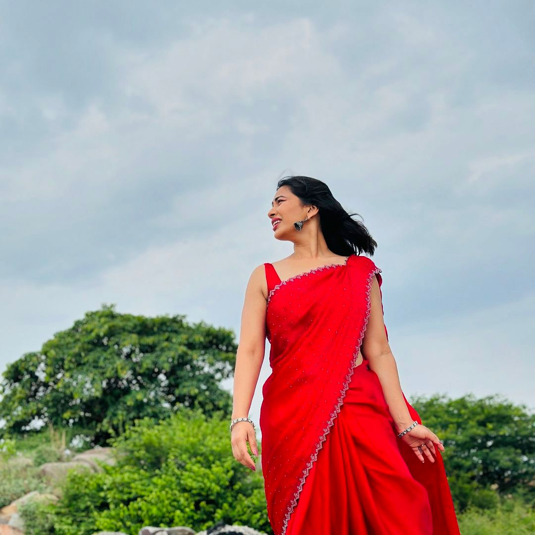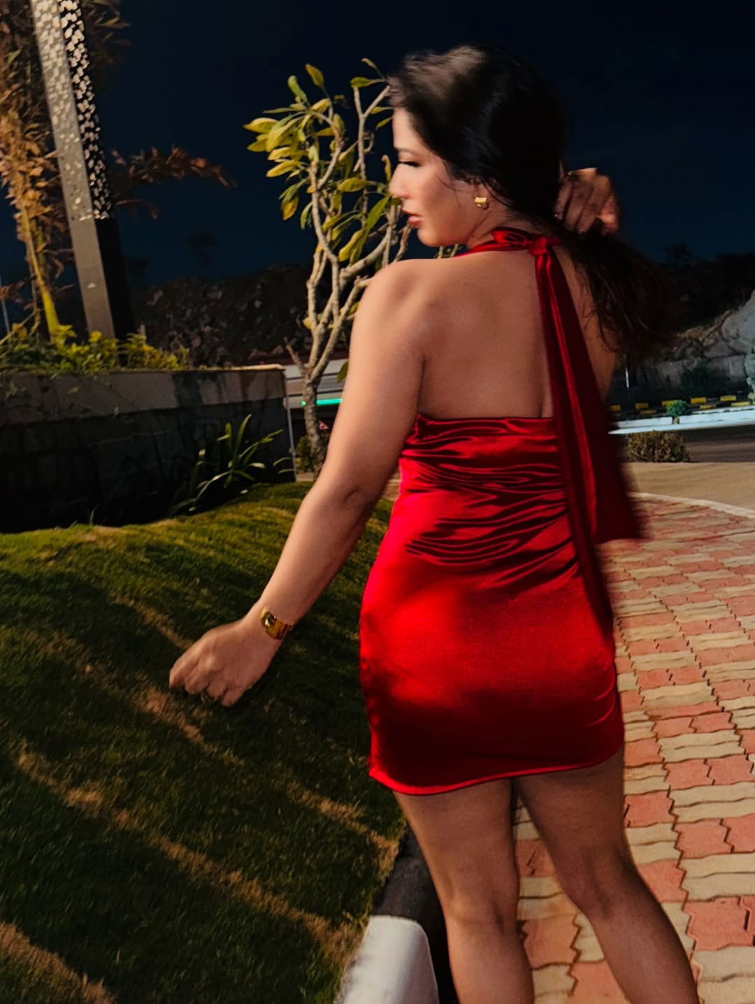The recent post on her feed showcases herself in a one-piece which is a red colored dress with sleeveless.