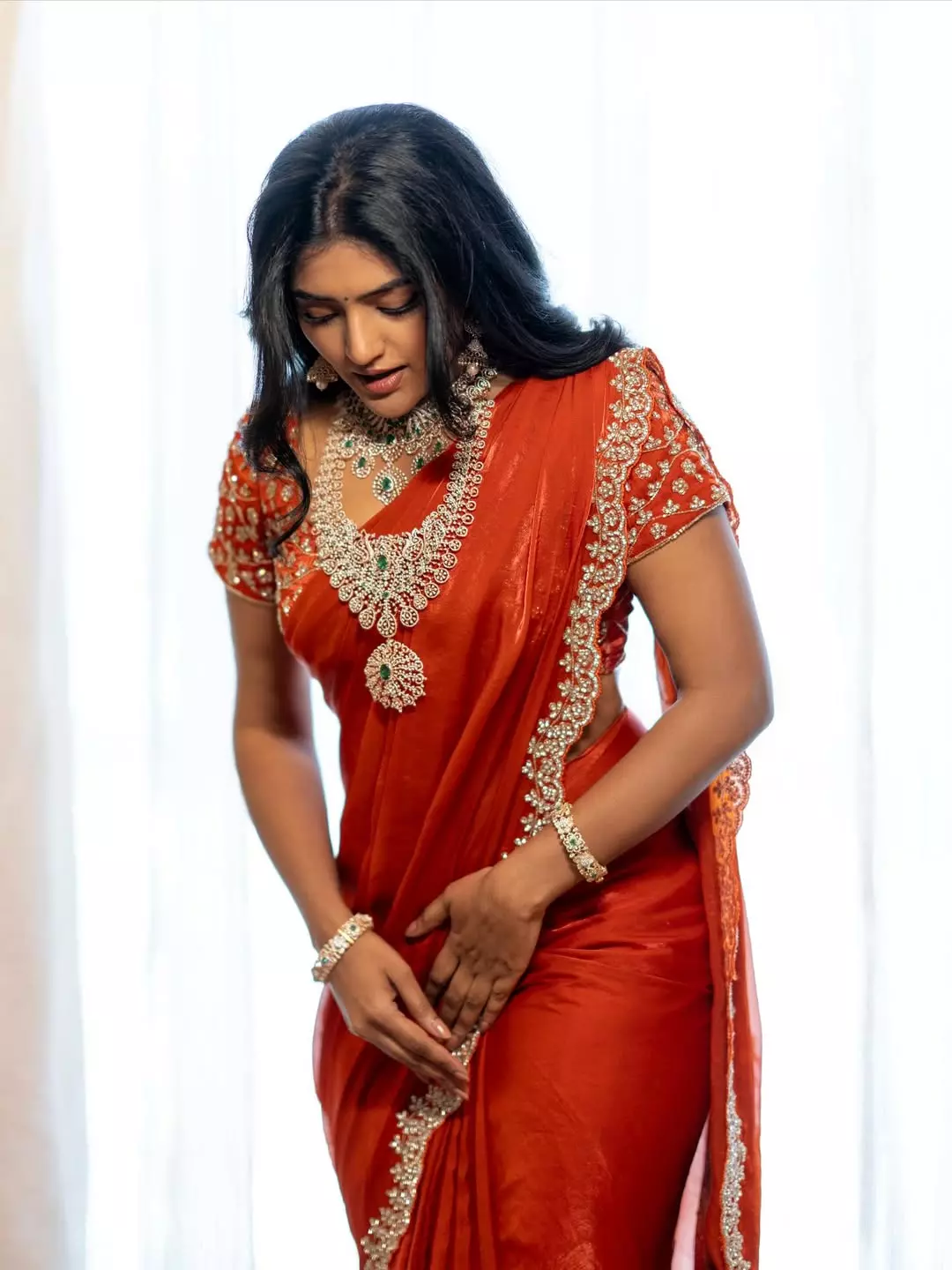 By: Tupaki Desk | 14 Nov 2025 4:52 PM ISTEesha Rebba ignites the hallway in molten rust-red silk, gold zari vines crawling along the border like liquid fire while the matching blouse glints with delicate embroidery. One hand lifts a dangling jhumka, the other gathers the saree—soft waves framing a half-smirk that’s equal parts tradition and tease. Styled by @manogna_gollapudi Saree @khwab.bykhushi HMU @venkateshparam Clicked by @lovely_photography_official—the Pelli Choopulu star just turned six yards into pure seduction.