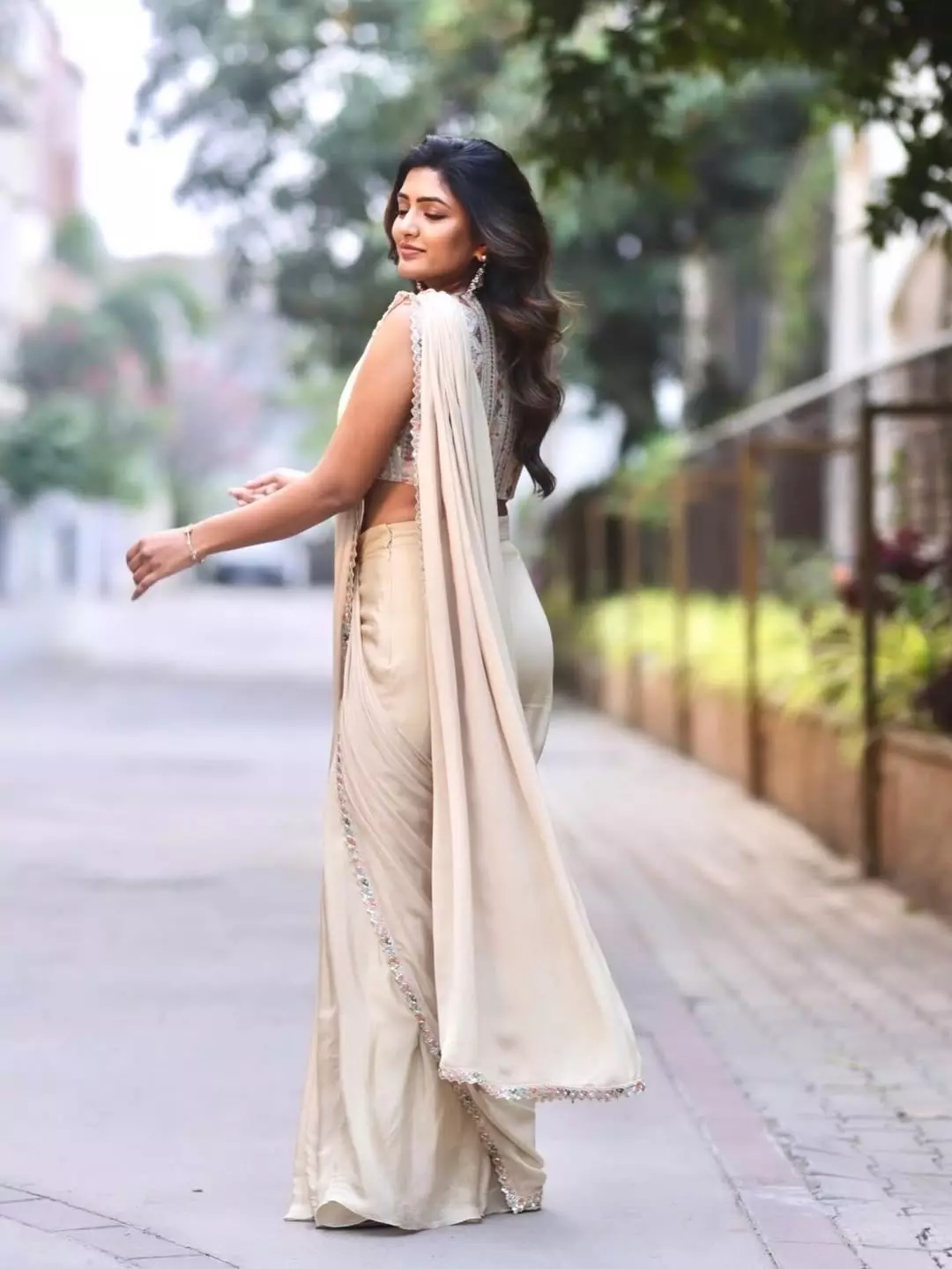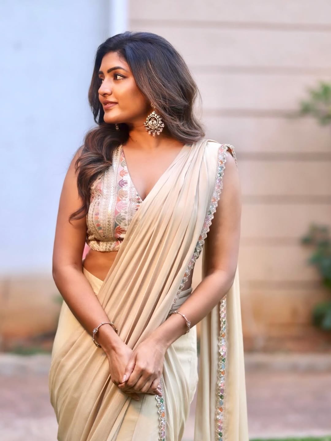 Eesha Rebba, the elegant Telugu actress born on April 19, 1990, in Warangal (now Telangana), continues to enchant fans with her stunning photo collections. In this radiant beige saree look, she stands poised in a garden setting, her flowing pleats and embroidered blouse accentuating her natural grace, long wavy hair, warm smile, and sparkling earrings under soft daylight.