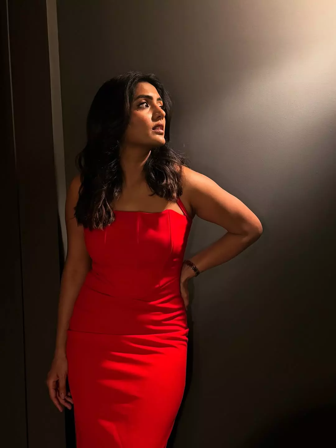 Eesha Rebba�s latest photo drop makes a clear statement, bold, simple, and sharp. She�s seen in a fitted red dress with a plain square neckline, standing still but never static. The lighting isn�t soft or flattering; it�s direct, carving out her features and adding depth. Nothing overdone, just well-placed shadows and confidence that doesn�t need extra help.