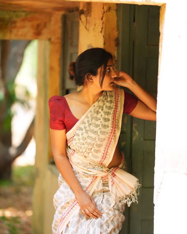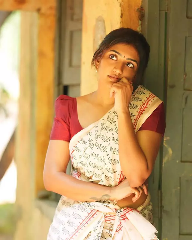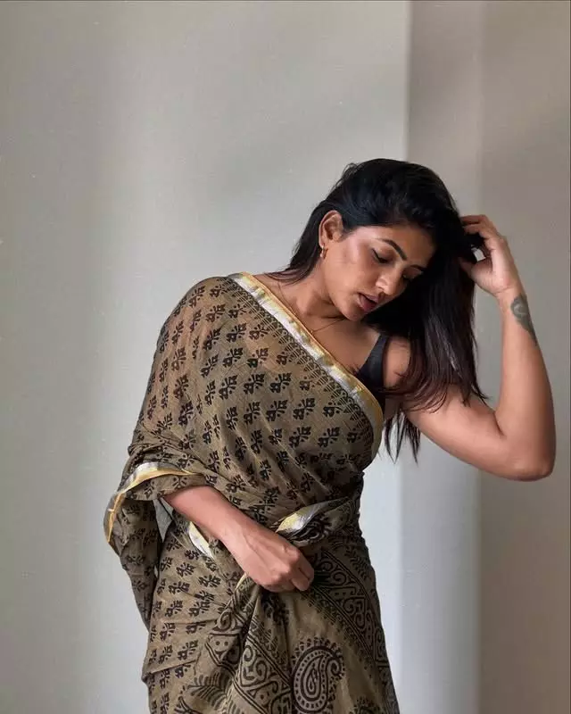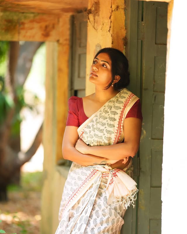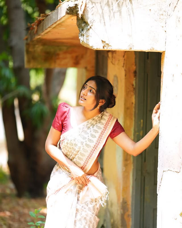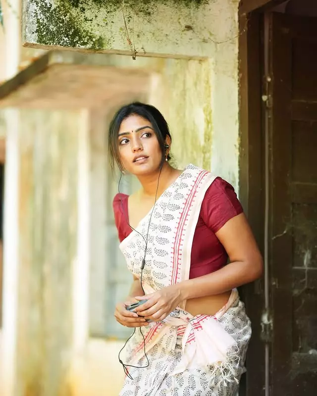 Tollywood actress Eesha Rebba recently shared a beautiful photo on Instagram where she is seen wearing a white floral saree. Her hair is tied up and she appears to be enjoying music creating a calm and elegant look. The photo was taken by photographer Rahul Shebtoed and has become popular among her fans.