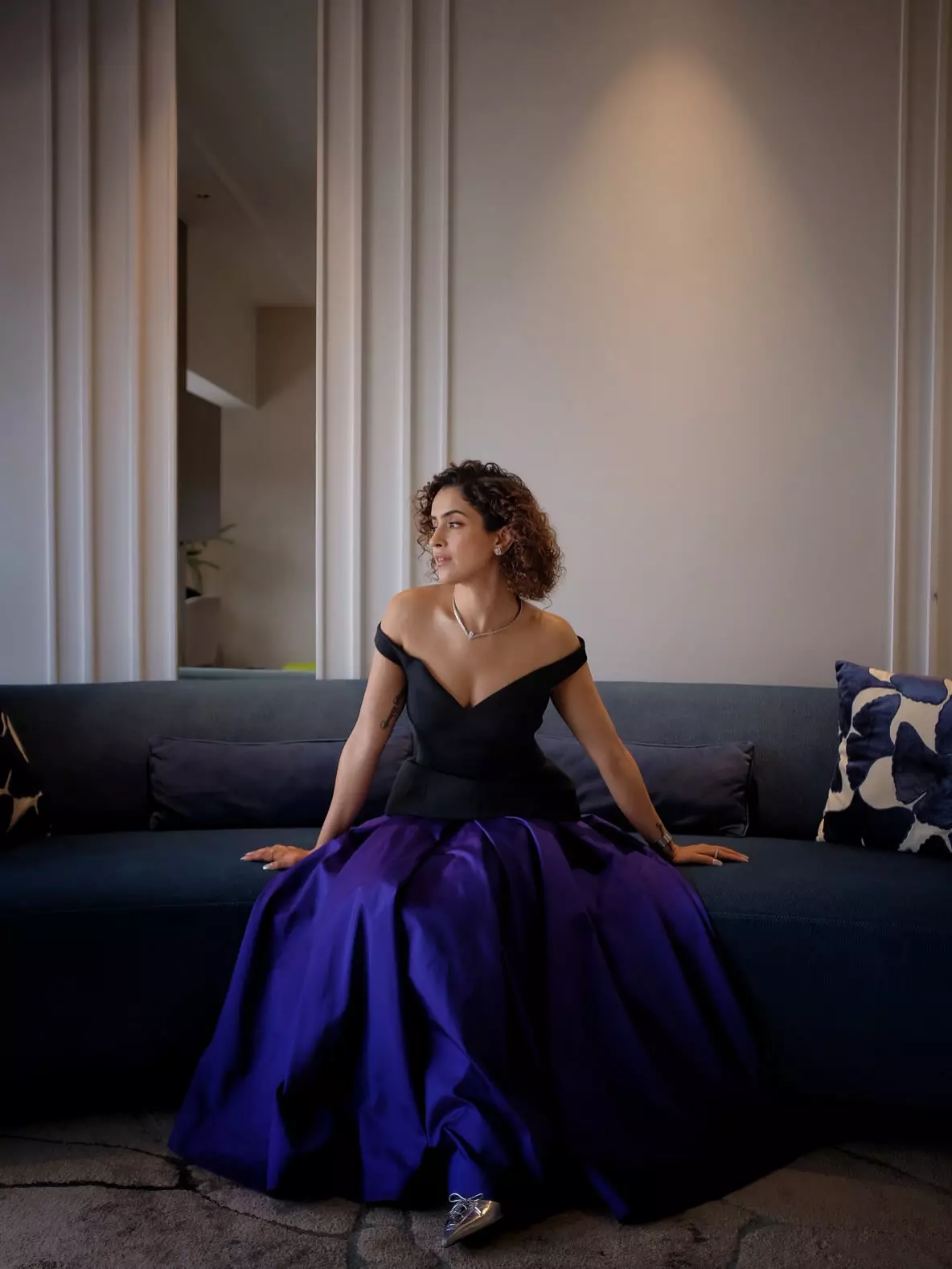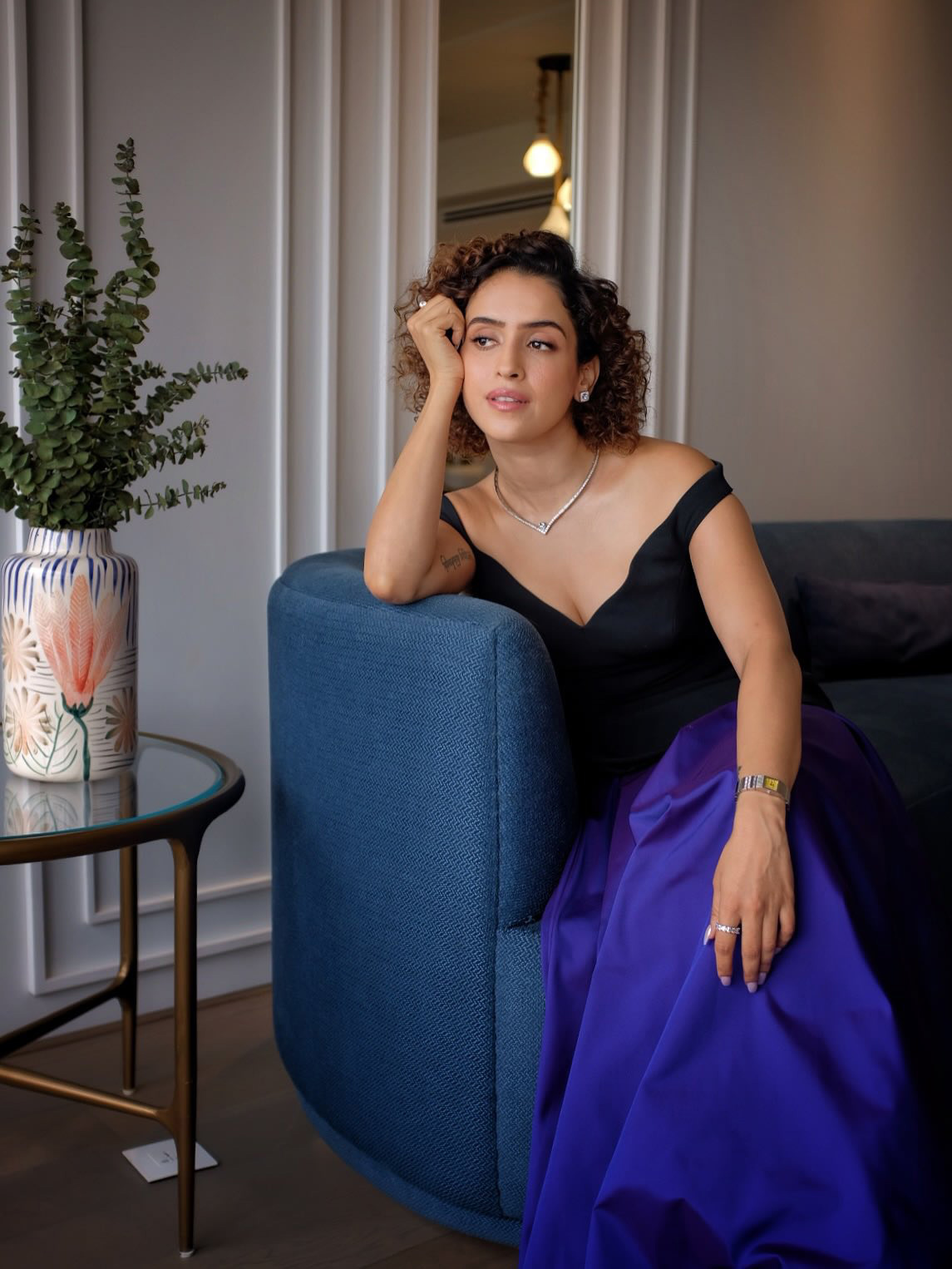 Sanya Malhotra once again proves that minimalism and class can be the most powerful fashion statements. Dressed in a stunning off-shoulder black bodice paired with a rich purple satin skirt, Sanya radiates timeless elegance with a modern twist. Her signature curls, soft-glam makeup, and delicate jewelry complete the look effortlessly balancing grace and strength. The poised posture and thoughtful expression capture her ever-growing maturity as both an actress and a fashion icon.
