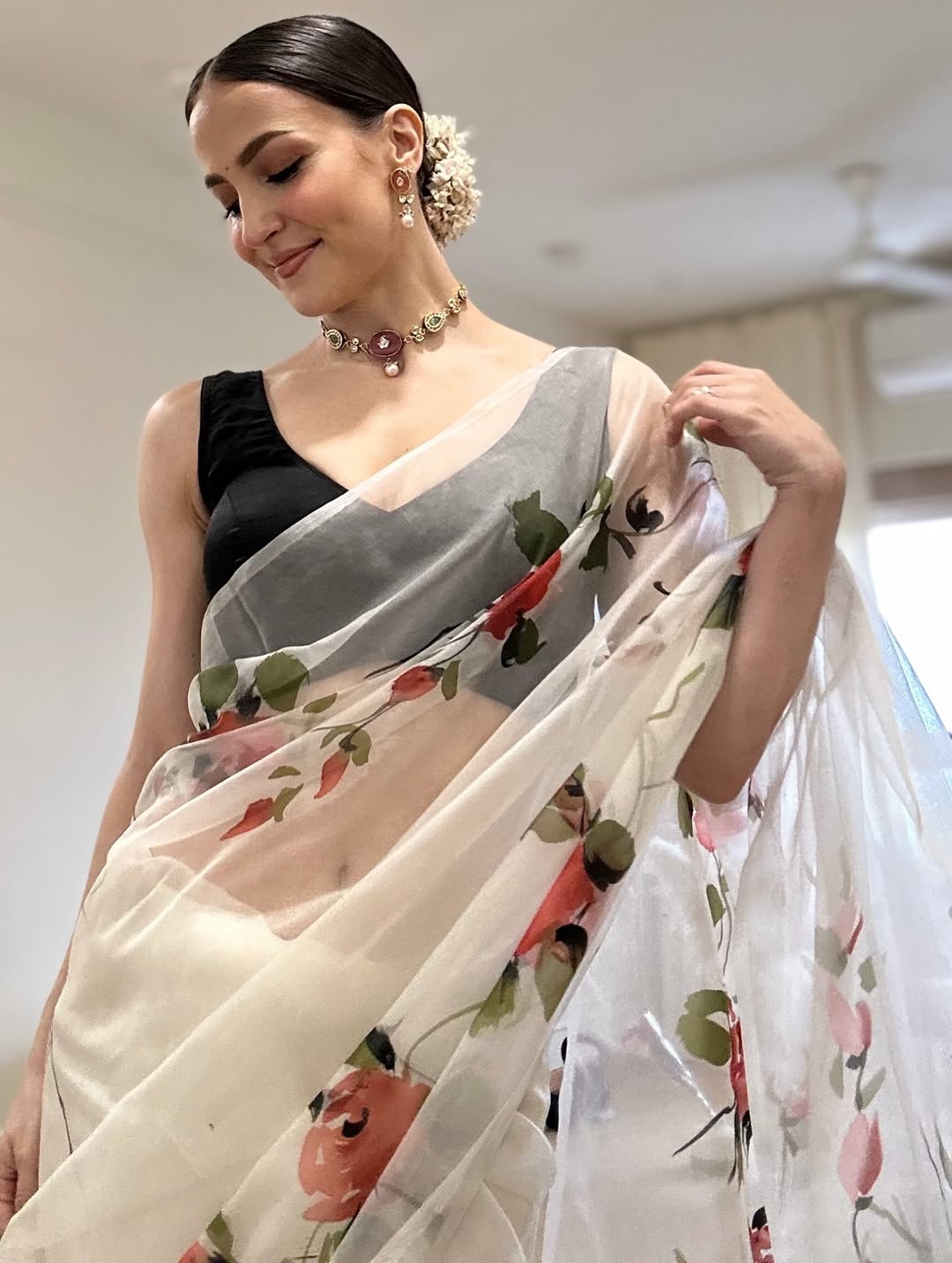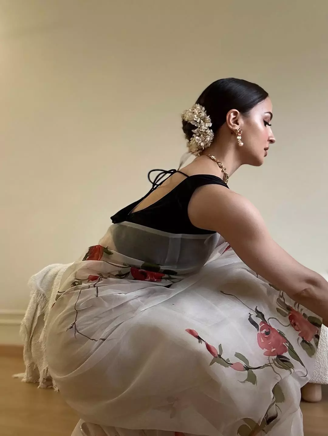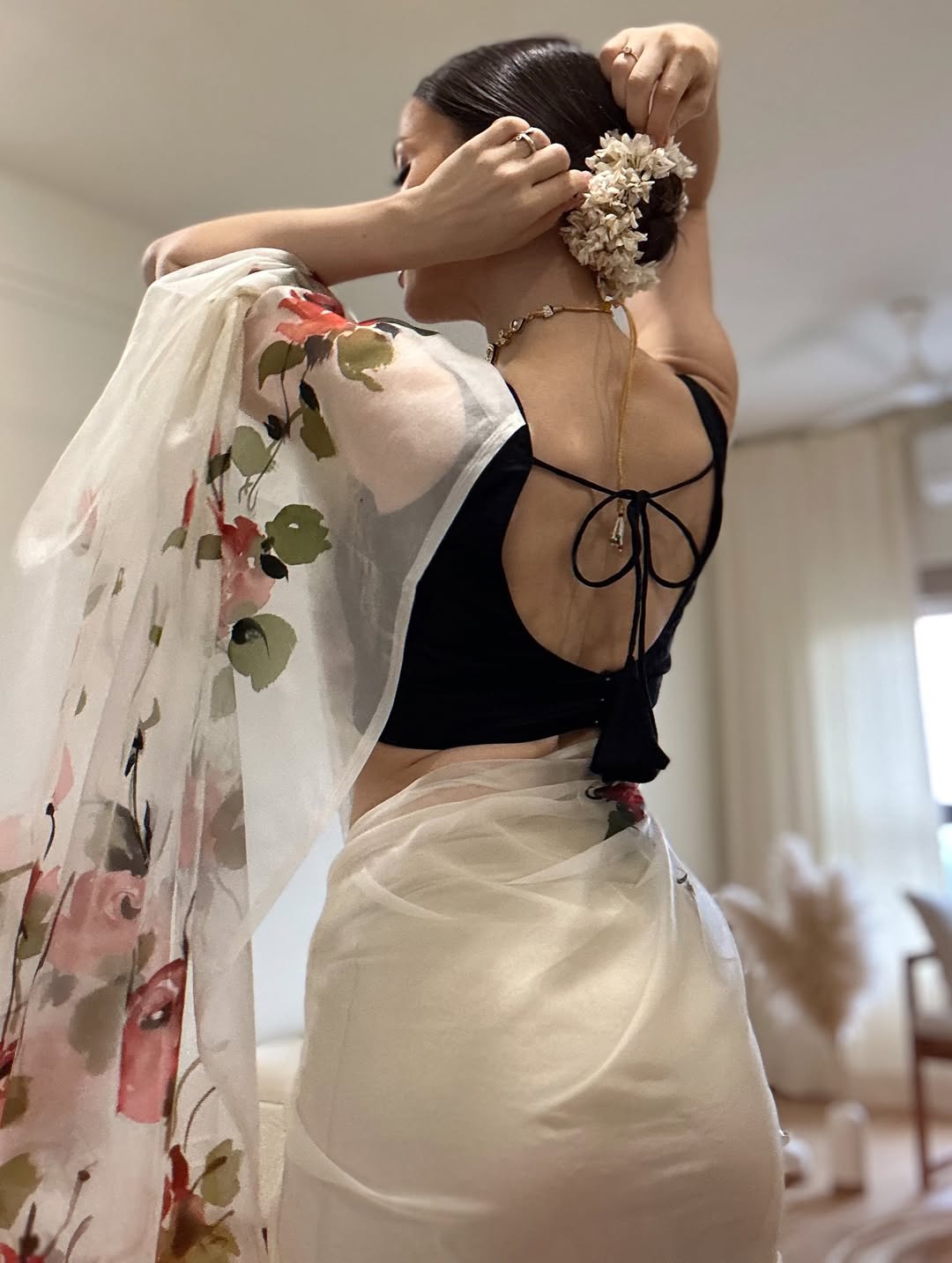 She posted a picture of herself in a soft floral saree. She completed her look with a black blouse, a delicate choker, and earrings. Her hair was neatly tied back with flowers.