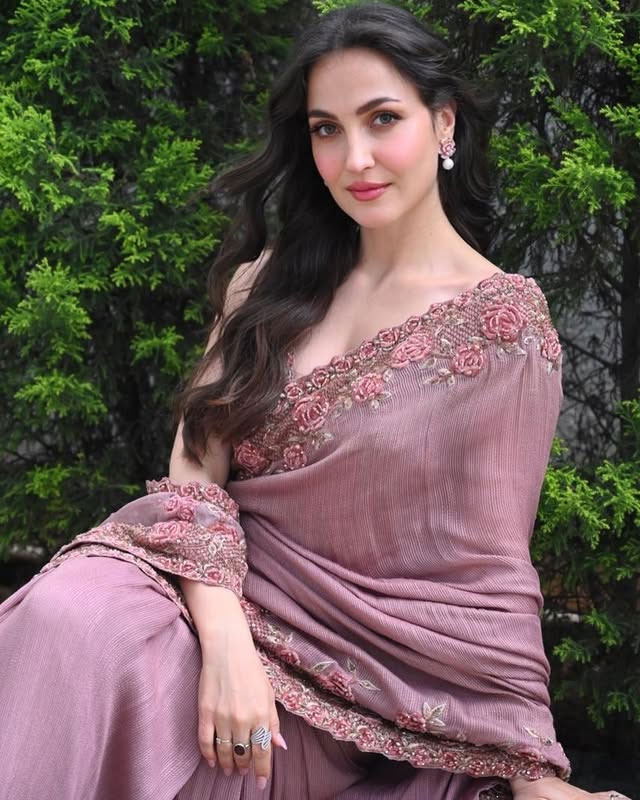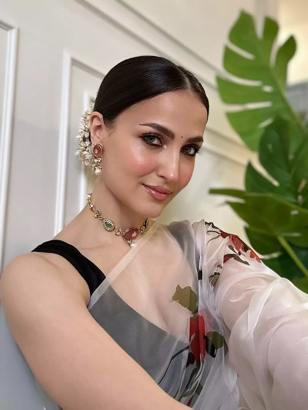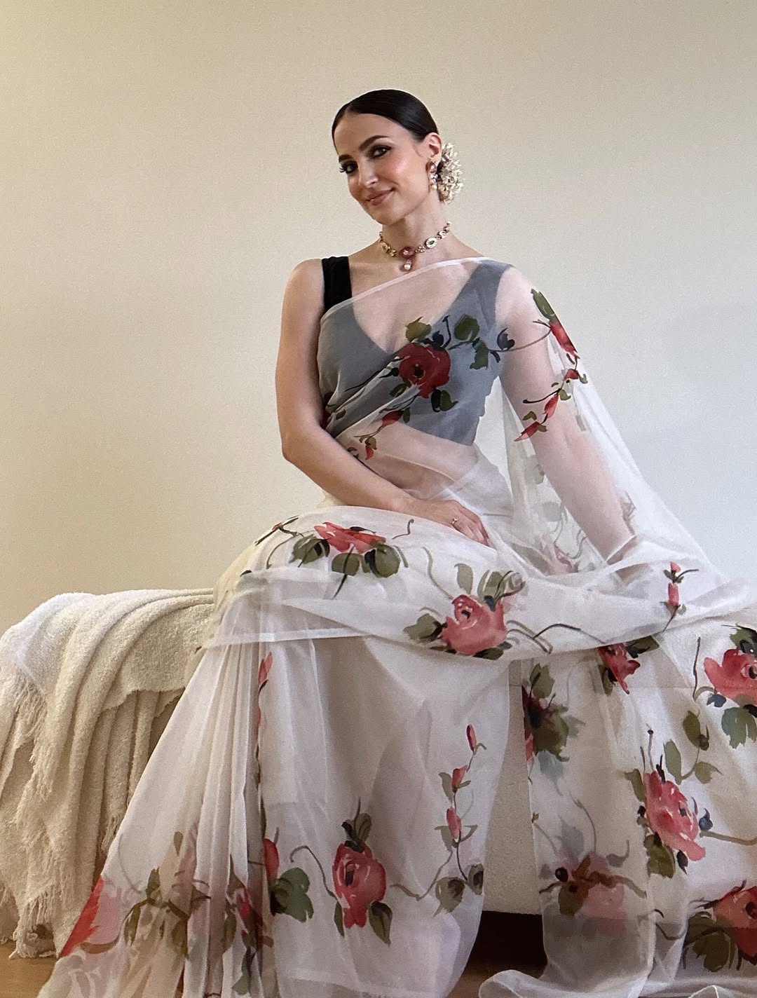 Elli AvRam shared a graceful moment on Instagram that caught everyone’s attention. She posted a picture of herself in a soft floral saree. She completed her look with a black blouse, a delicate choker, and earrings. Her hair was neatly tied back with flowers. The overall vibe of the post carried a touch of culture and elegance.