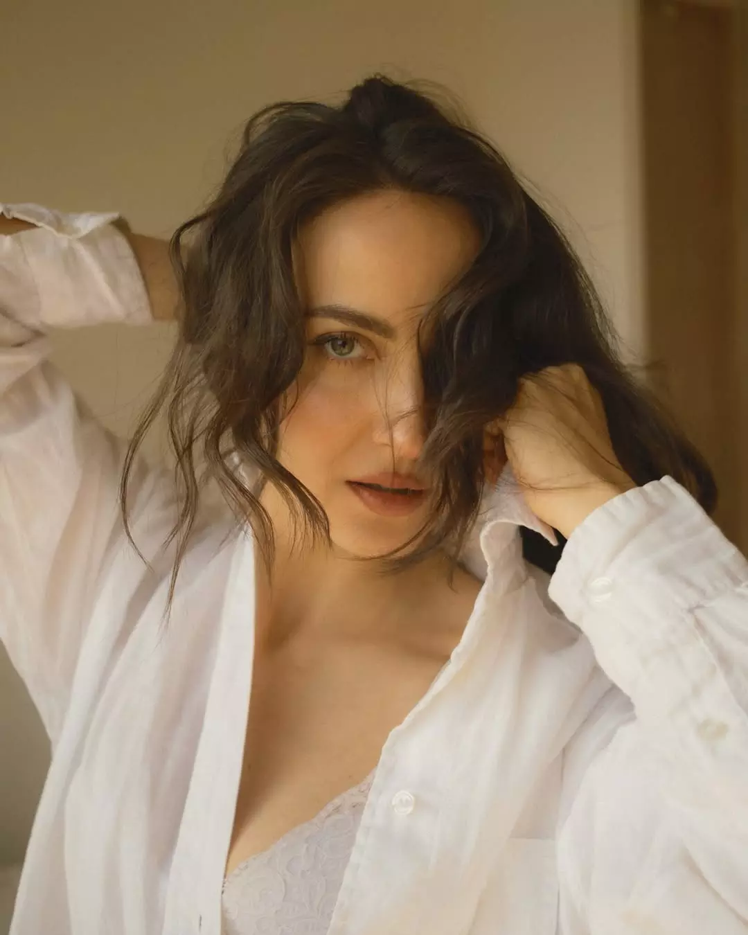 Elli AvrRam captivates in this intimate bedroom photoshoot, radiating effortless sensuality and natural beauty. Lounging on a fluffy white rug against neutral walls, she wears an oversized white linen shirt unbuttoned to reveal subtle lace beneath, her long wavy dark hair cascading over her shoulders. With a sultry gaze and soft lighting highlighting her features, the image evokes quiet confidence and allure.